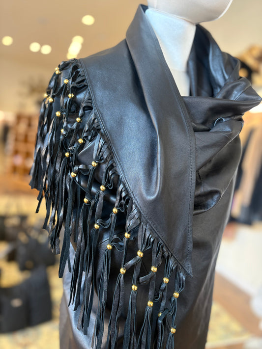 Maxi stola in pelle di agnello nera con frange