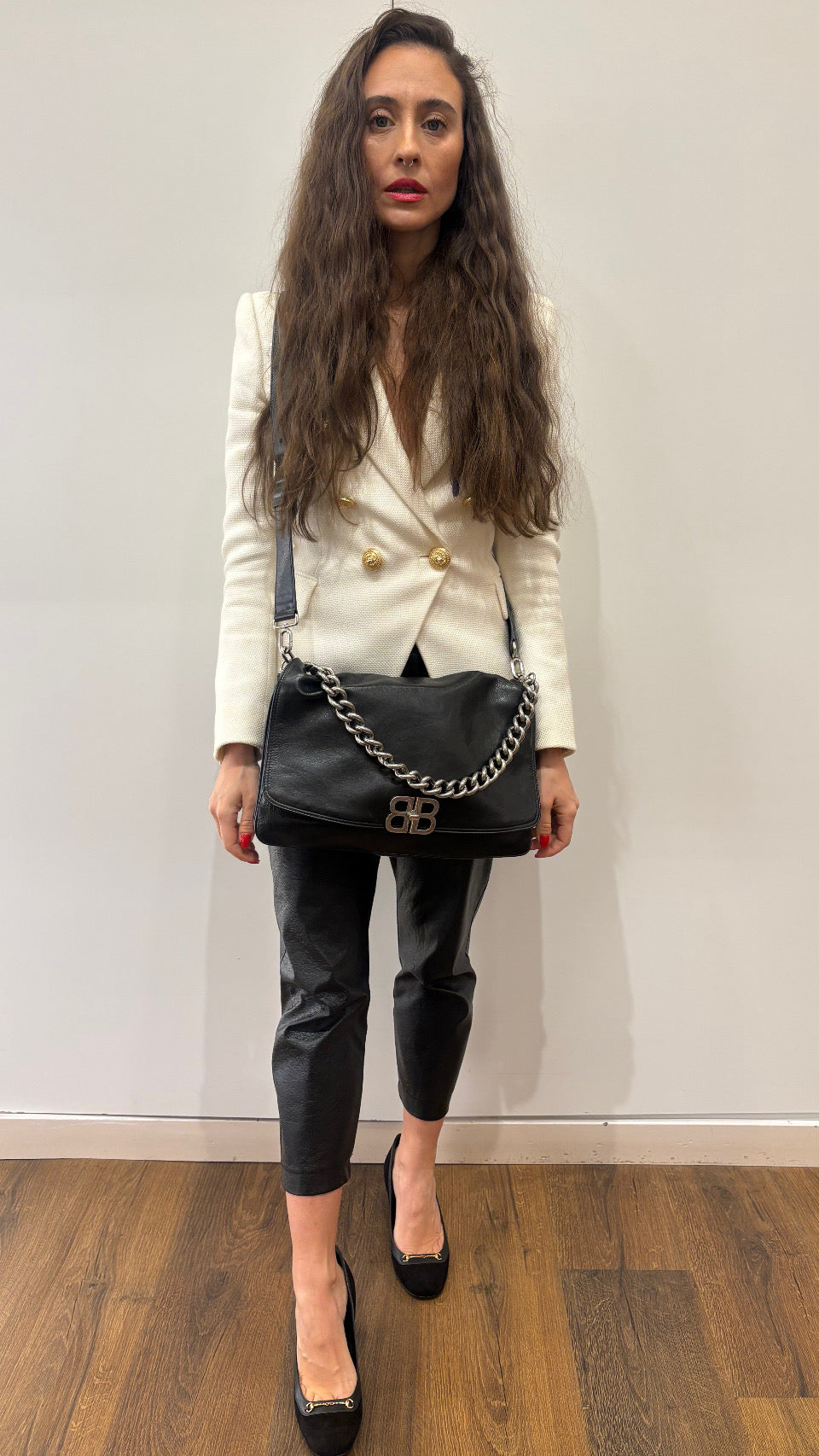 - Tracolla: È dotata di una doppia opzione di trasporto: una tracolla regolabile in pelle e una catena in metalloremovibile, entrambe coordinate con le finiture della borsa.
