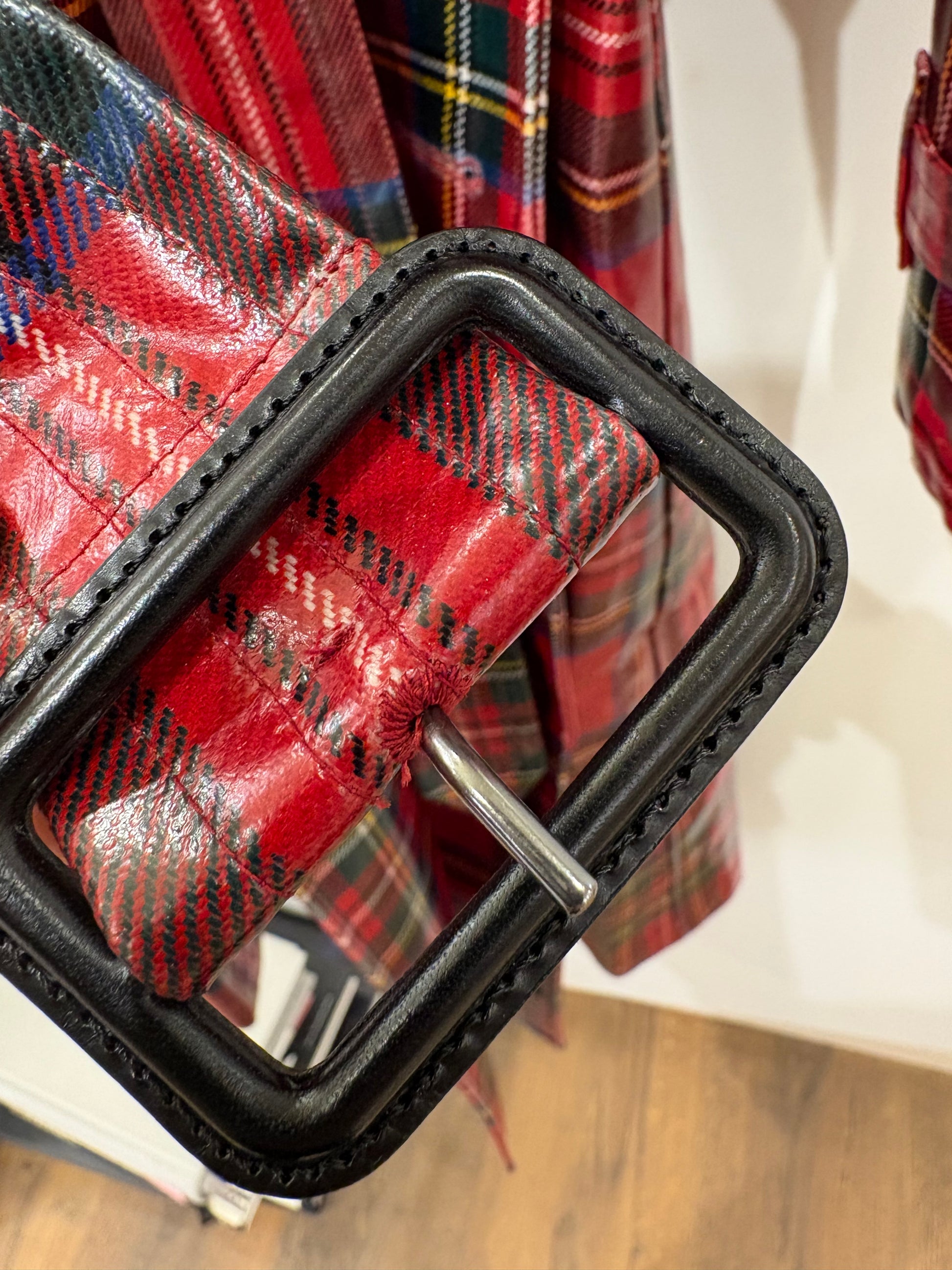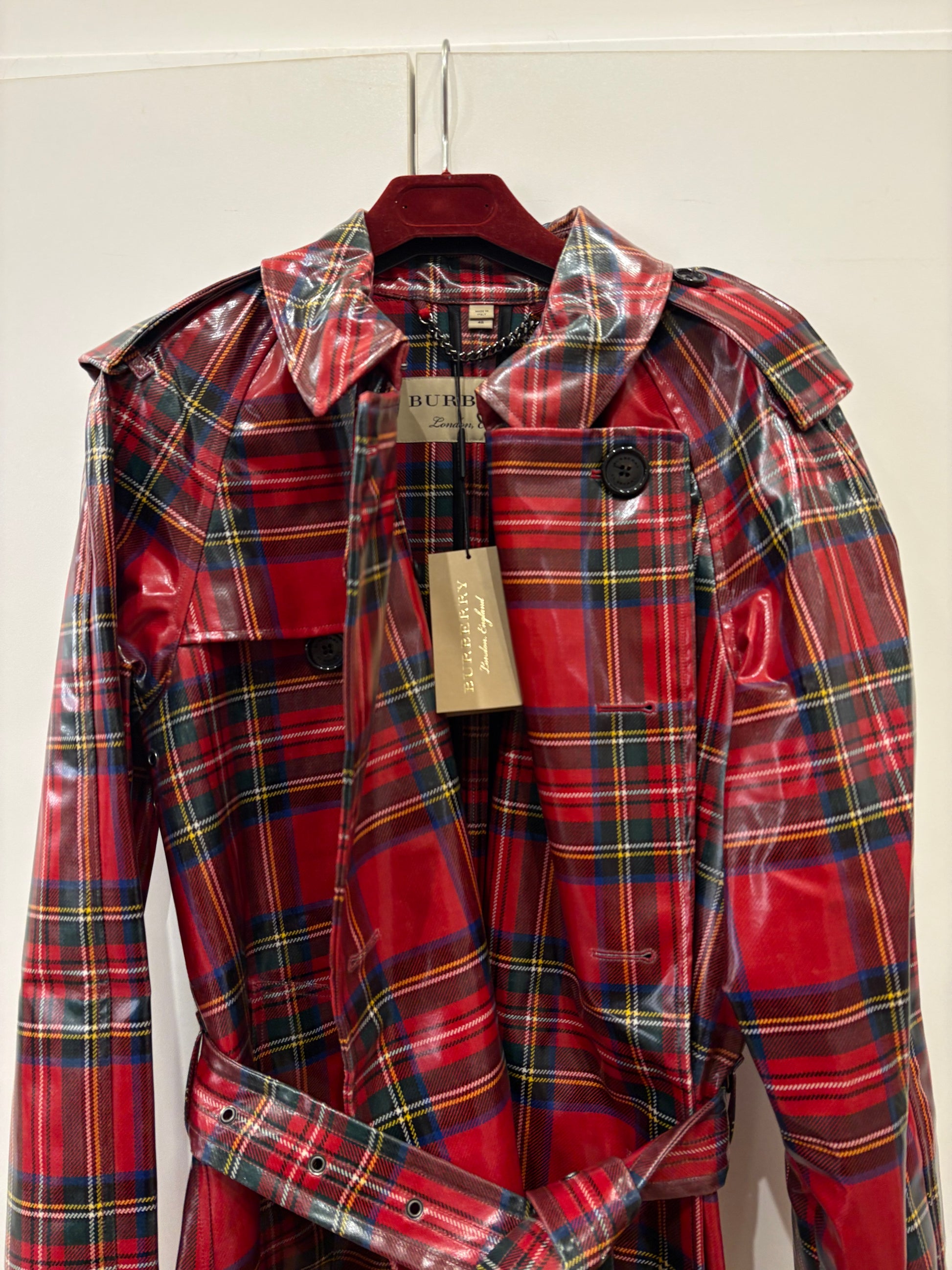 Burberry trench coat in vinile lucido o plastificato tartan stampato , interno lana vergine , taglio trench tradizionale ma reso originale e simpatico in questa versione !! Il cartellino indica la tg 48 che risulta regolare avviato , mentre la tg Italiana 44 lo preferisce over size e la tg46 lo preferisce comodo da indossare con il blazer sotto