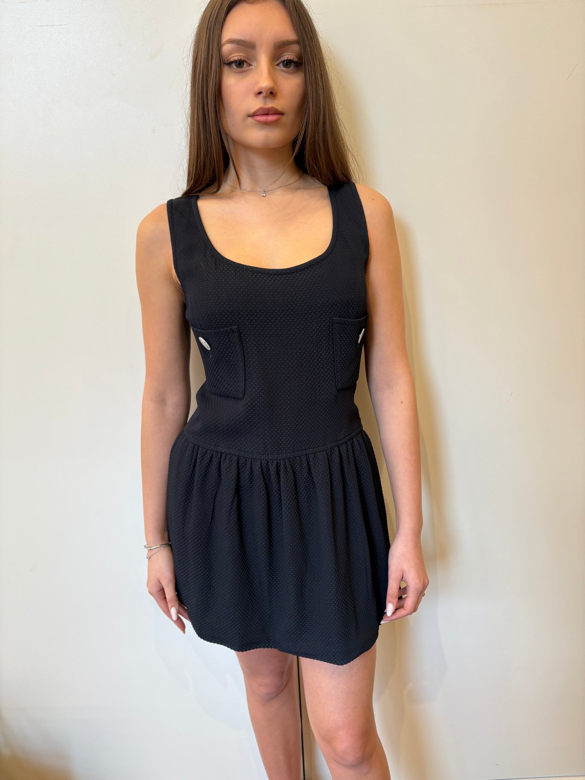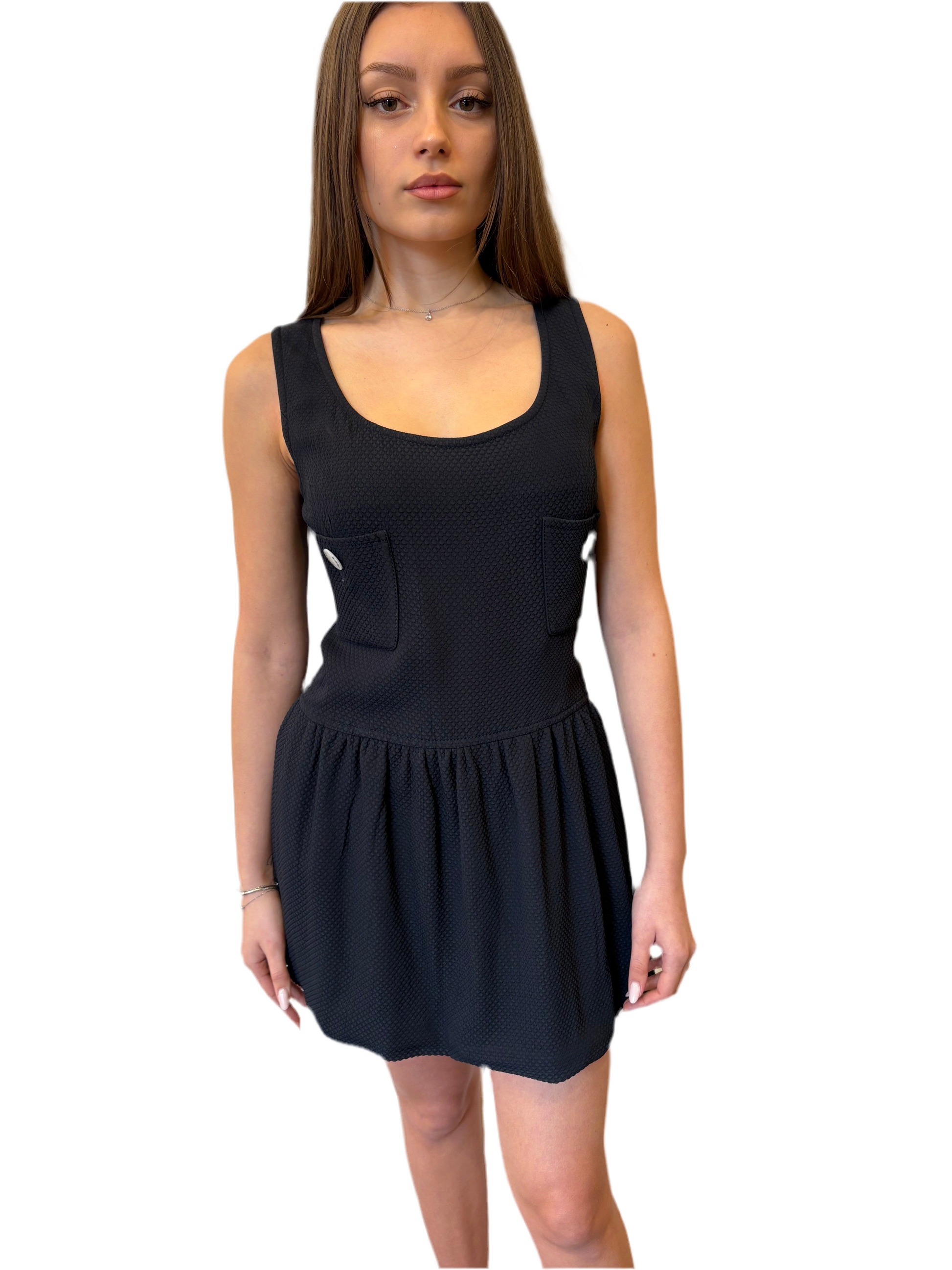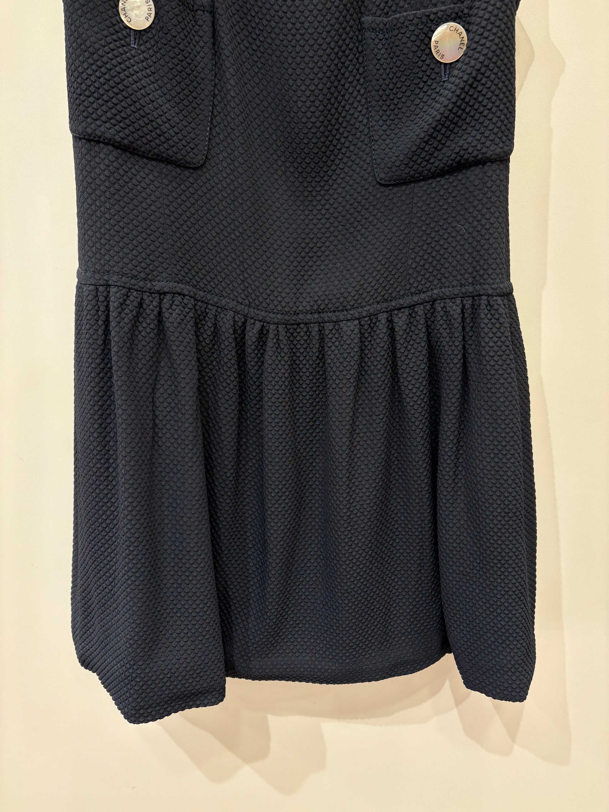 Chanel abito in cotone blu appena sopra il ginocchio orlo appena svasato vita bassa , due tasche frontali con bottoni in madreperla avorio con logo cc