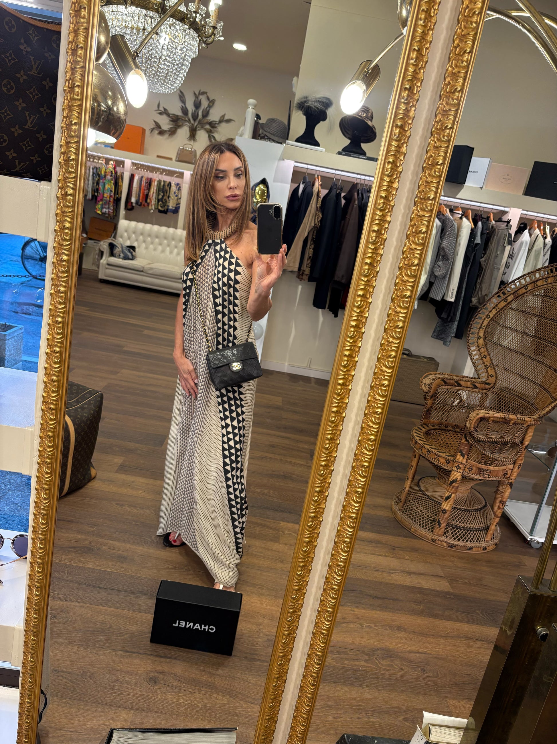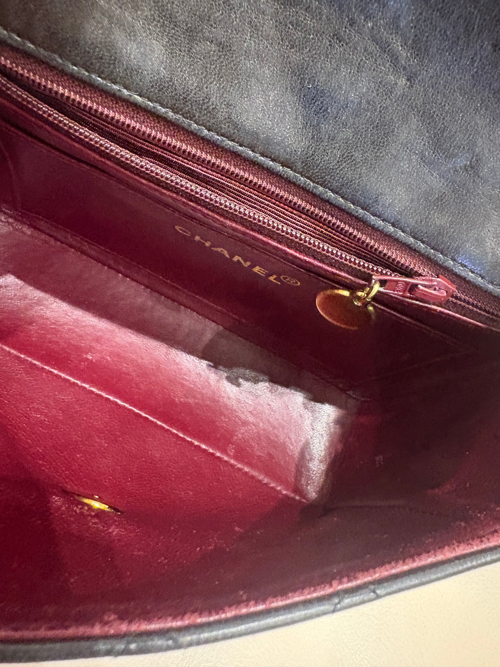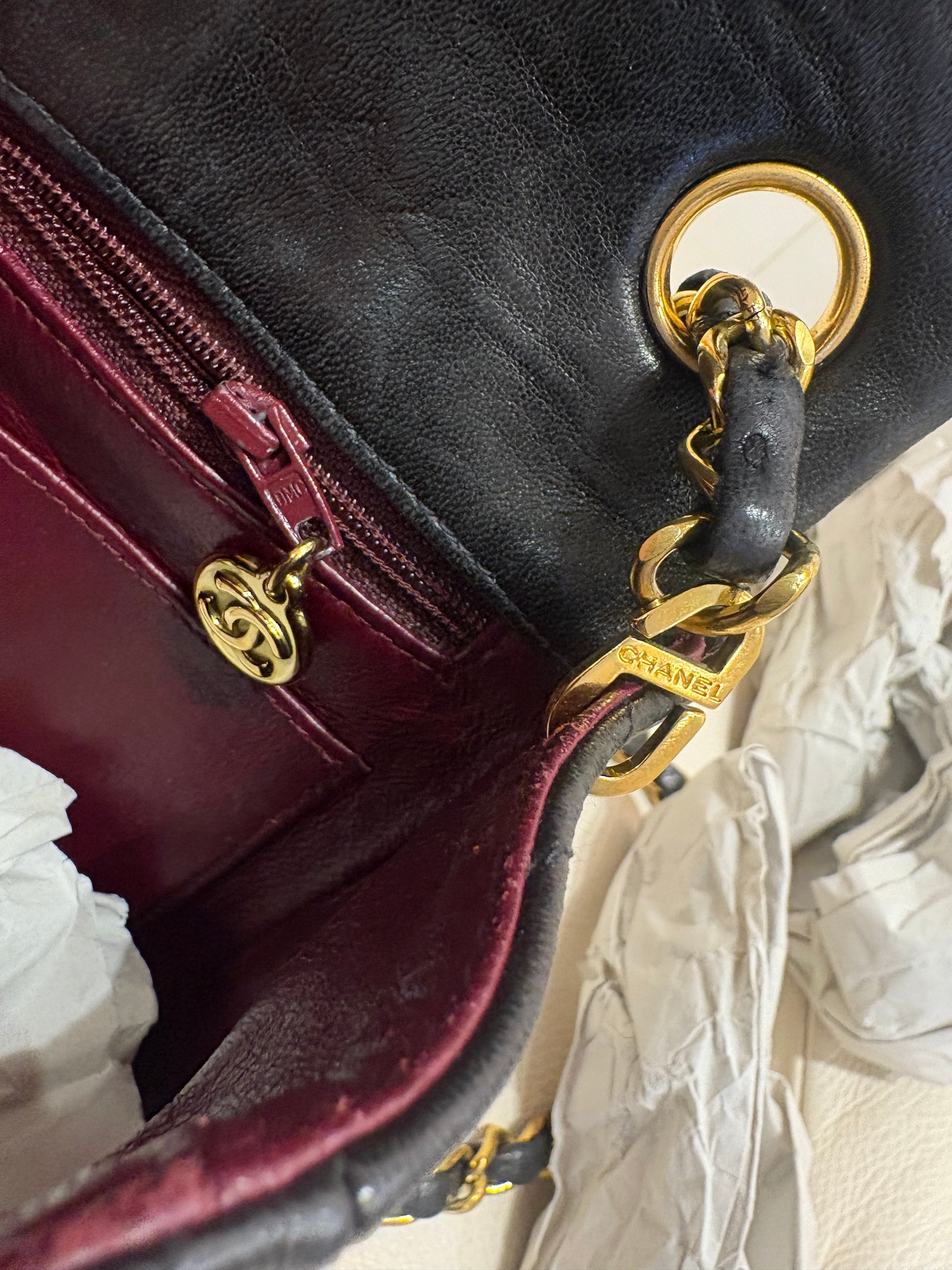 Nero, pelle agnello , design con trapuntatura a diamante, tracolla in pelle con catena dorata , chiusura con pattina frontale, caratteristica chiusura a girello CC, scomparto unico, tasca interna con zip, tasca interna a soffietto, caratteristico logo interno a doppia C incrociata, stampa interna con logo, tasca a soffietto sul retro e dettagli color oro. Condizioni ottime . Questo articolo Pre-owned è in ottimo stato . Completa di box