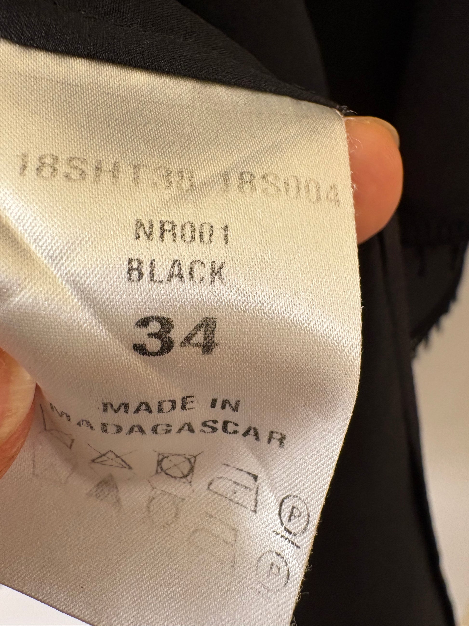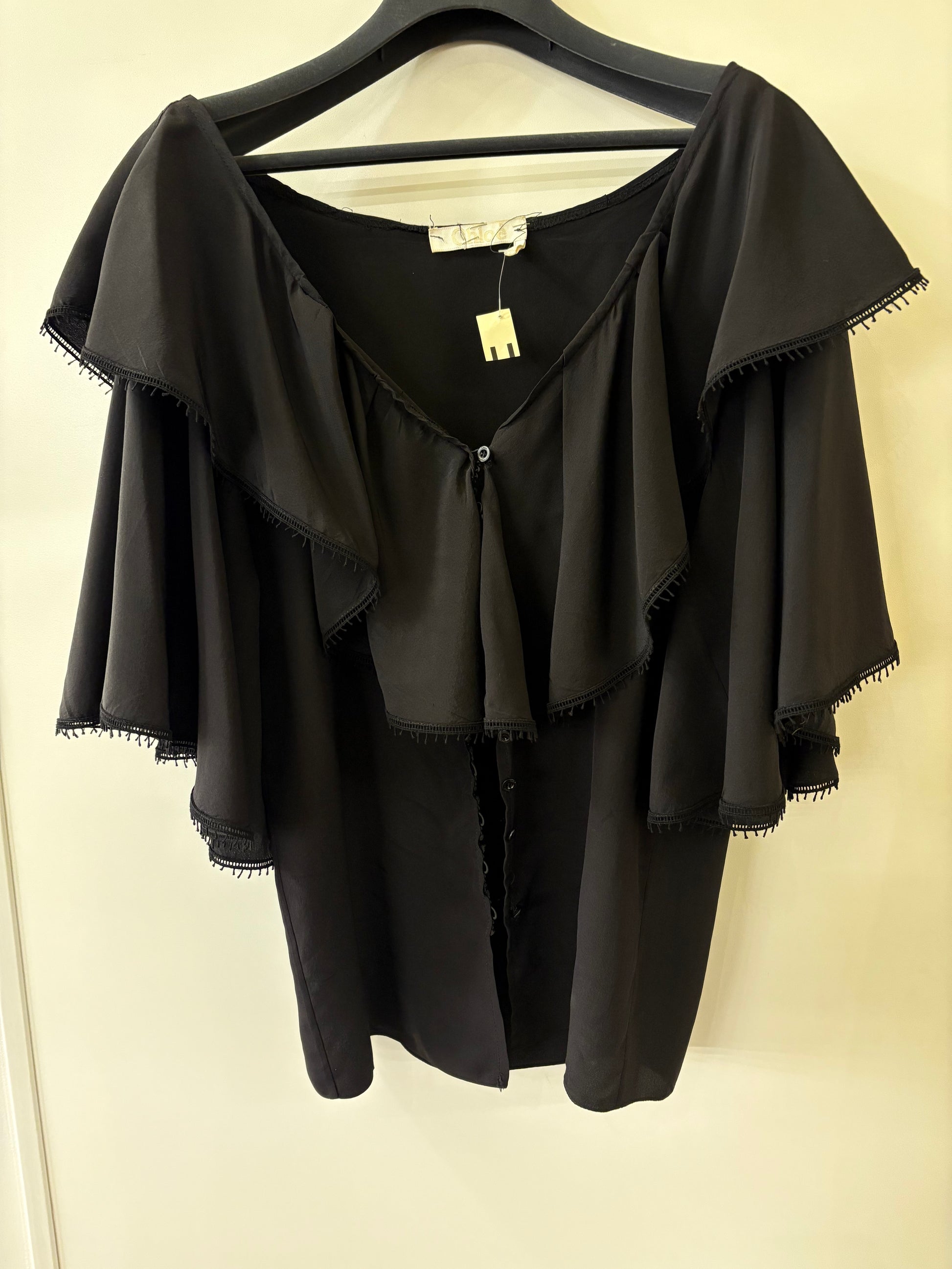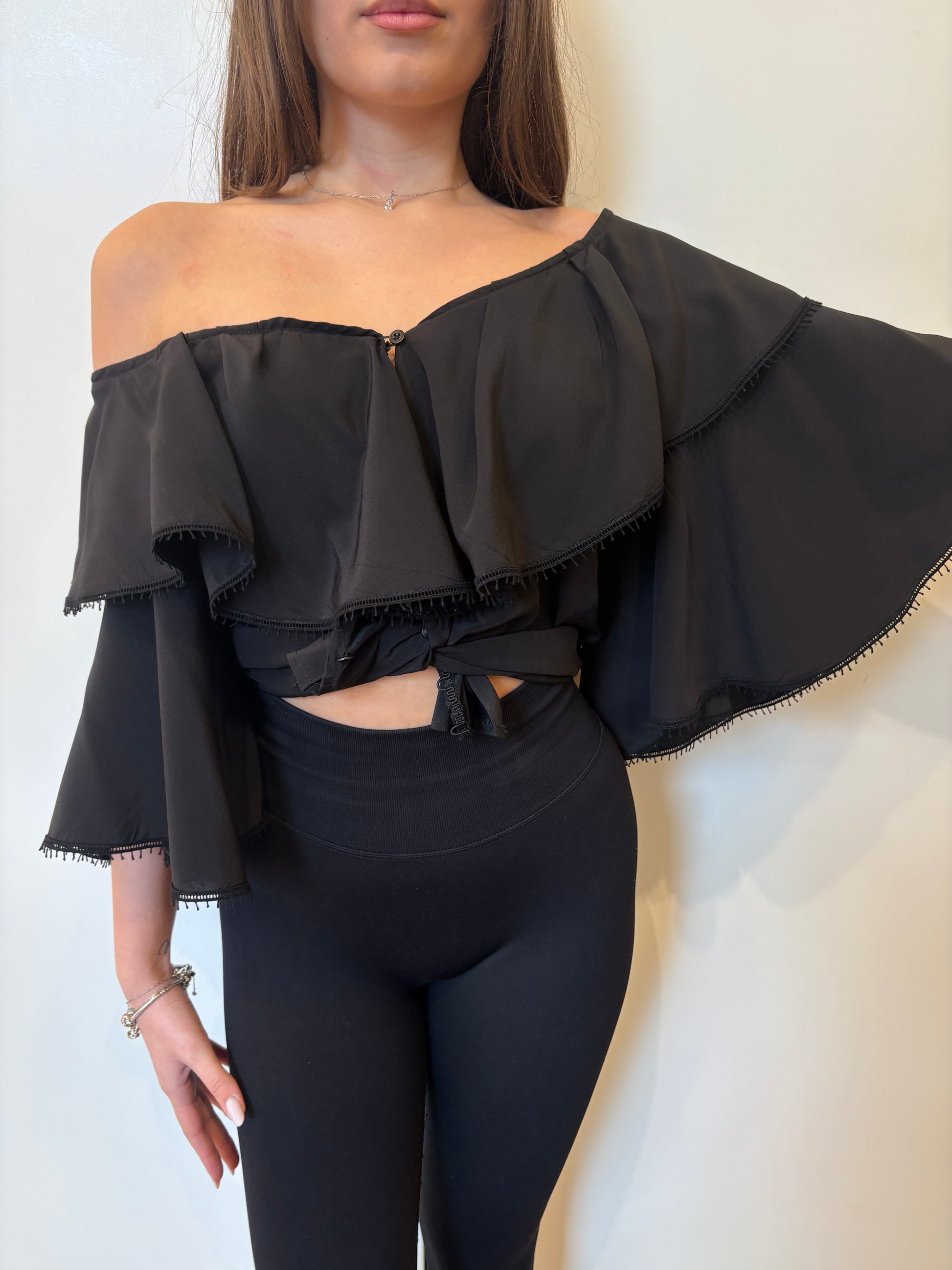 Chloe’ blusa in pura seta nera con doppio volants e maniche ampie 3/4 , scollo largo oppure profondo a seconda di come si preferisce indossare l’articolo . Abbottonatura centrale