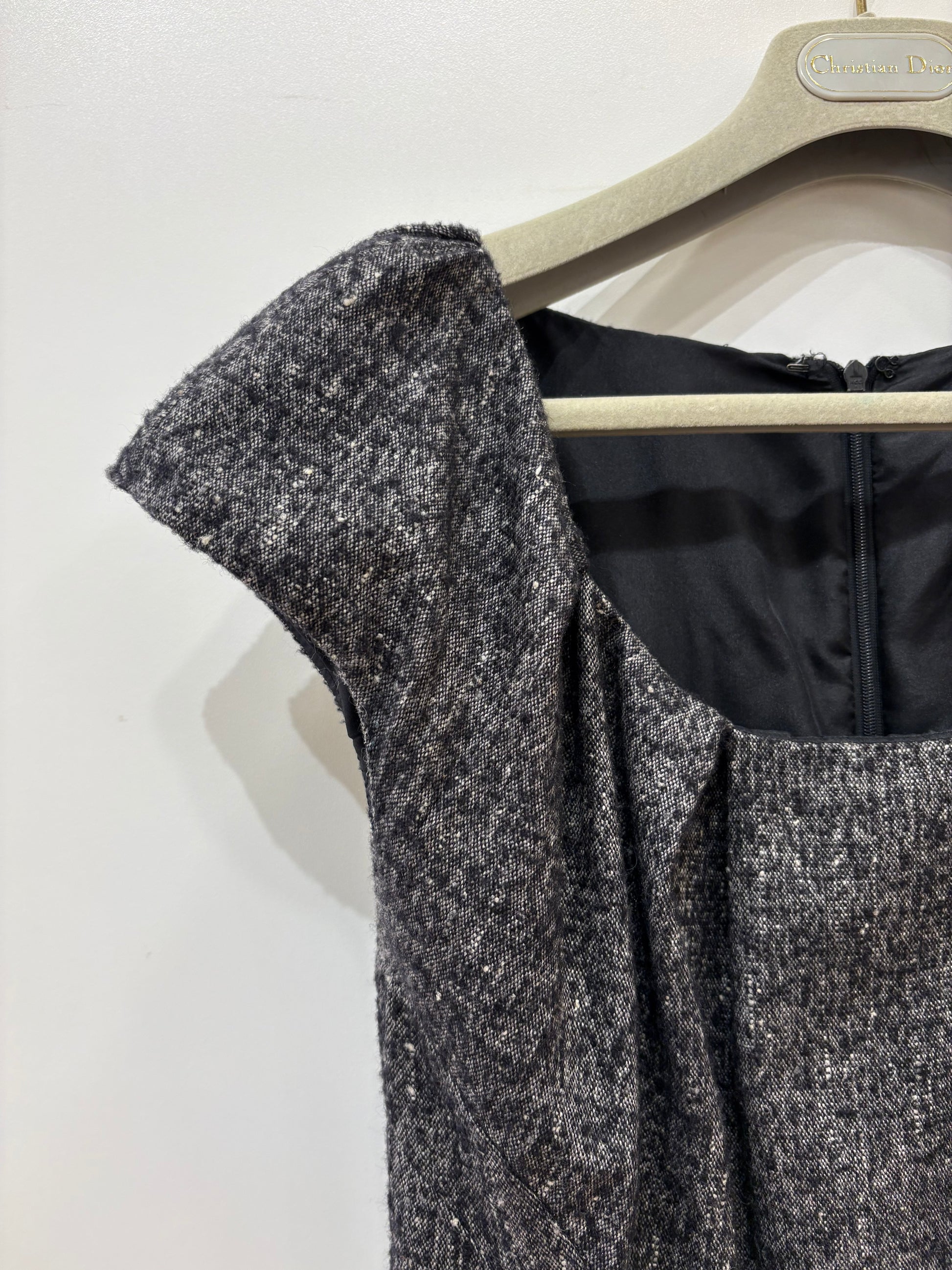 Delizioso abito Christian Dior vintage in lana tweed maniche pronunciate scese sull’omero , tasche ampie sul bacino e linea aderente sull’orlo ( tipico taglio sartoriale del brand da sempre presente nelle collezioni del passato fino ad oggi )