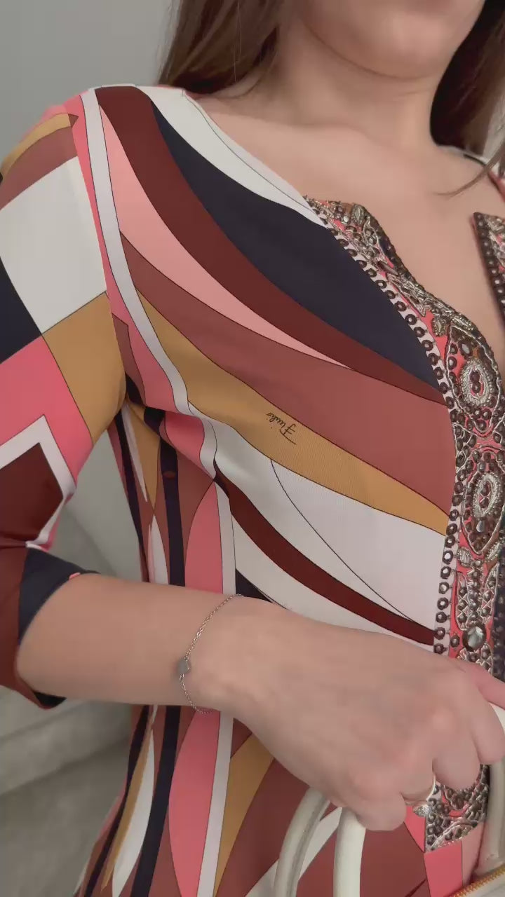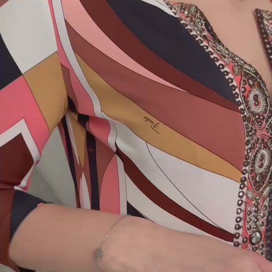 Abito lungo Emilio Pucci , fantasia geometrica inconfondibile del brand nei colori rosa pesca aragosta avorio con ricamo di perline bronzo sulla scollatura