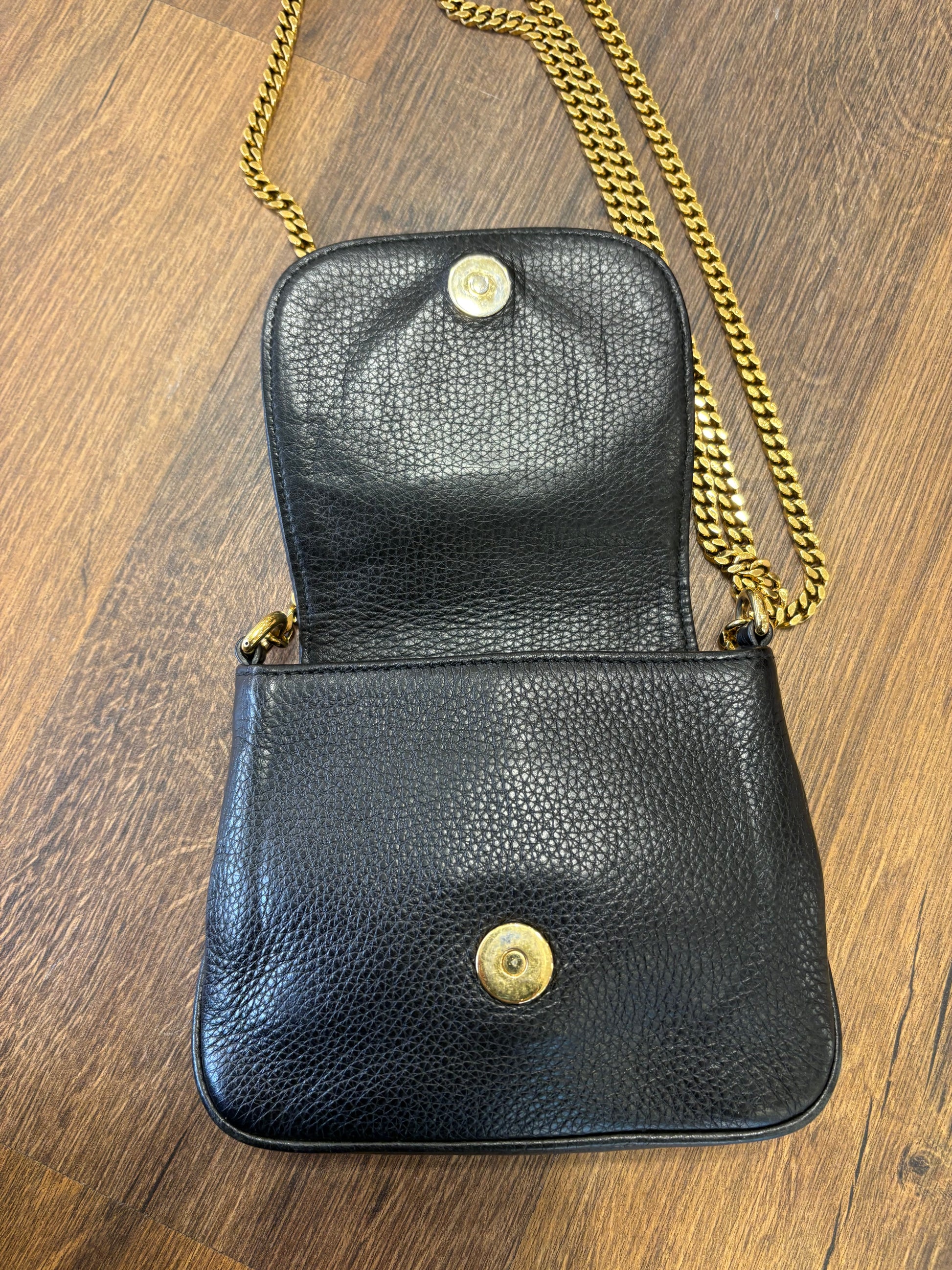 Gucci 1973 Chain Leather crossbody , modello elegante e versatile caratterizzato dall'iconico logo GG in metallo dorato sulla patta frontale. Modello da indossare a tracolla in pelle martellata nera e catena Groumette. Chiusura a calamita sotto la patta decorata con il logo "GG" rotondo d'archivio degli anni '70
