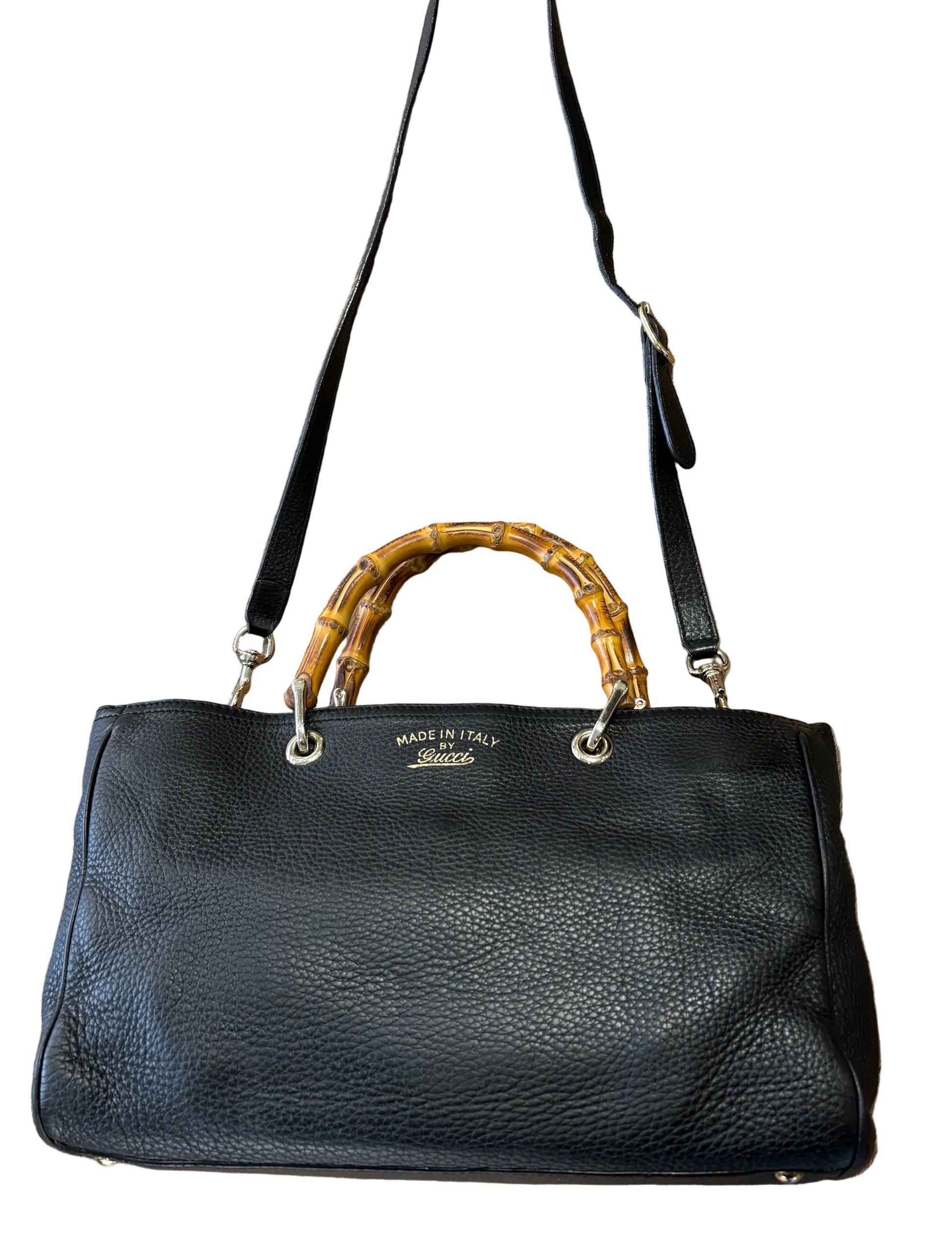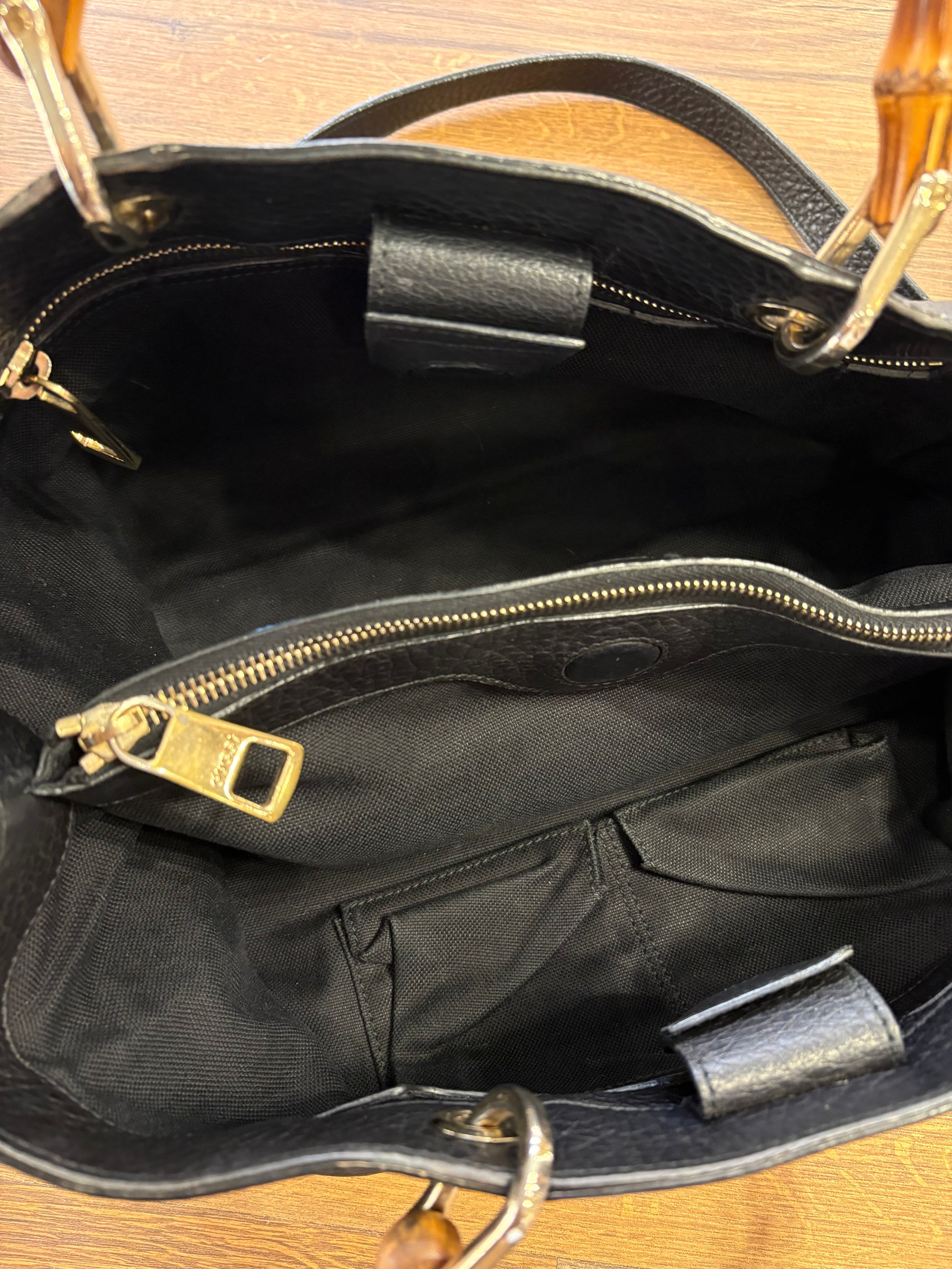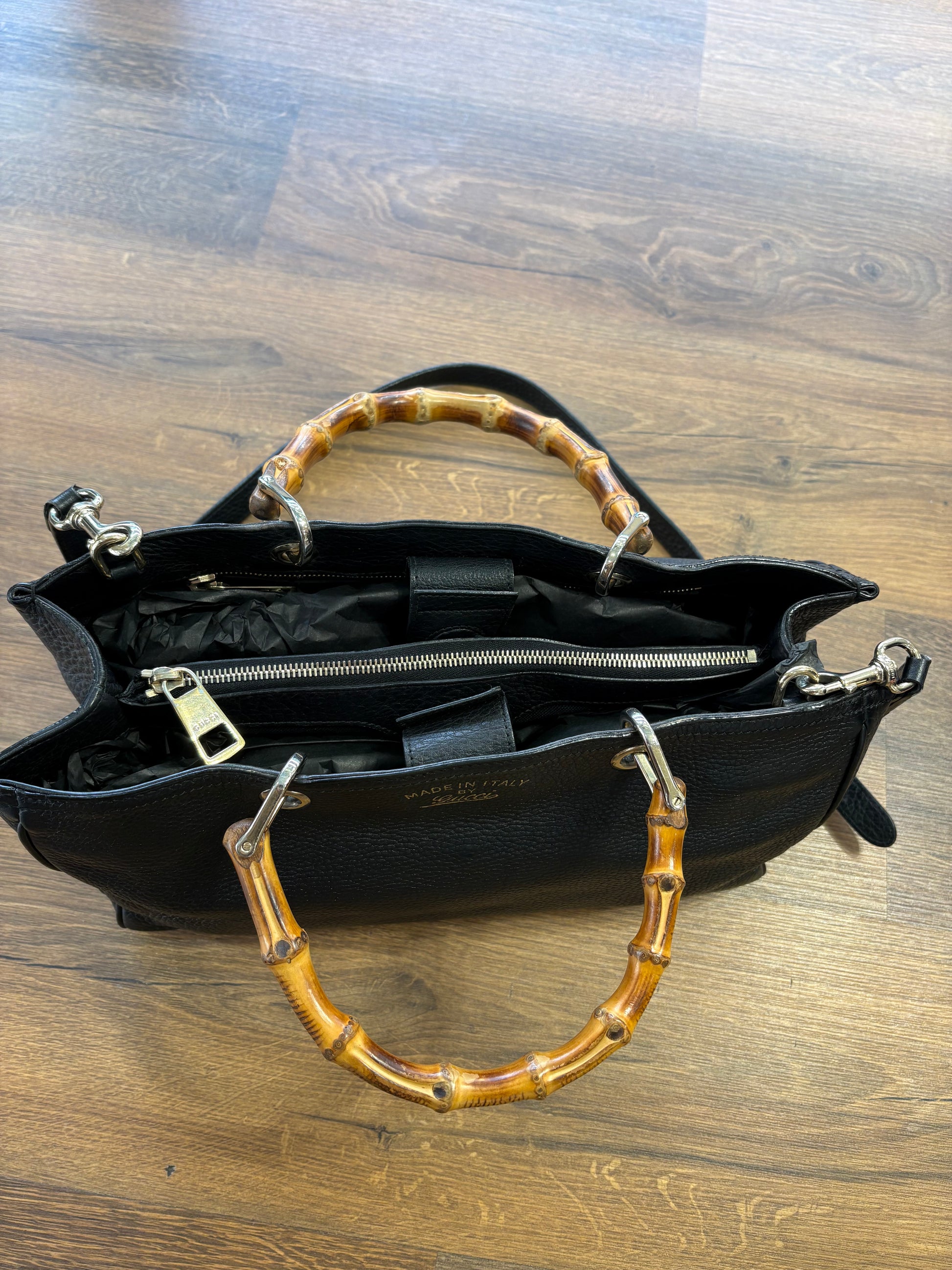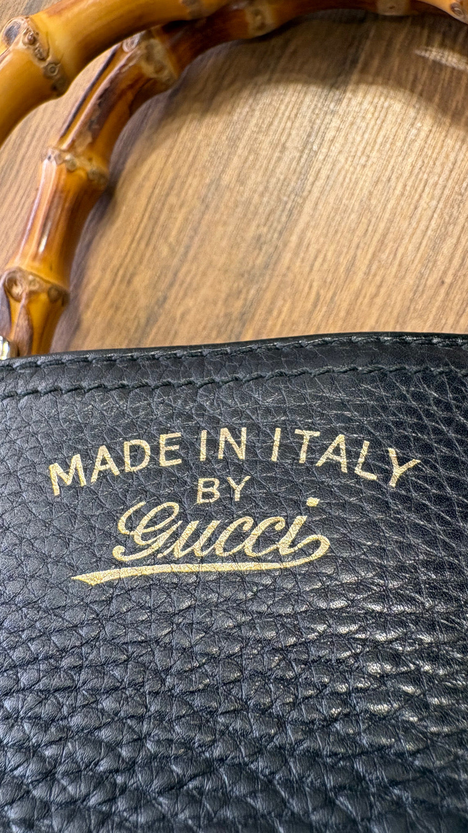 Doppio manico superiore in vero bambùcurvato a mano tramite calore e logo "Made in Italy by Gucci" stampato in oro sul fronte.
