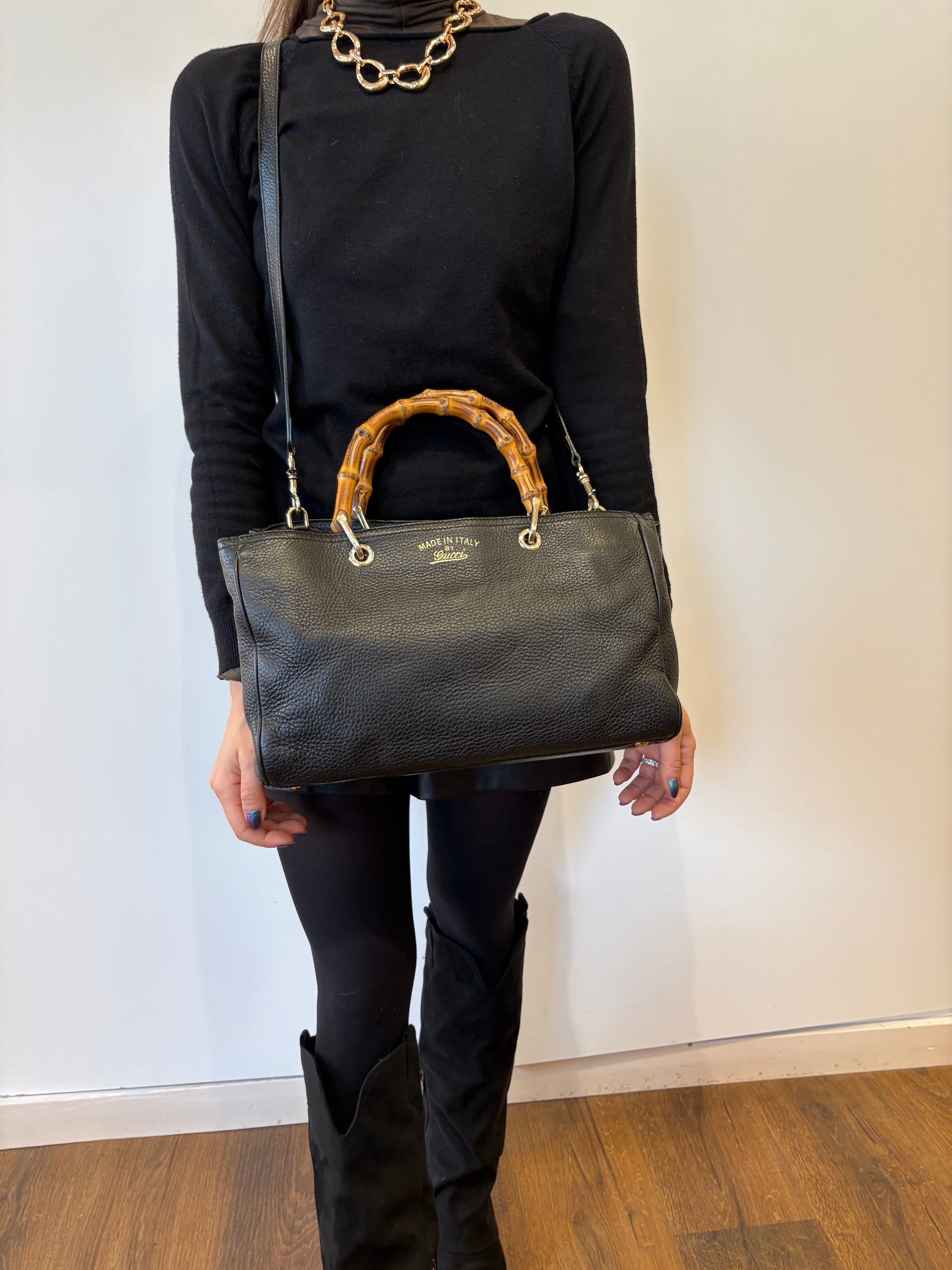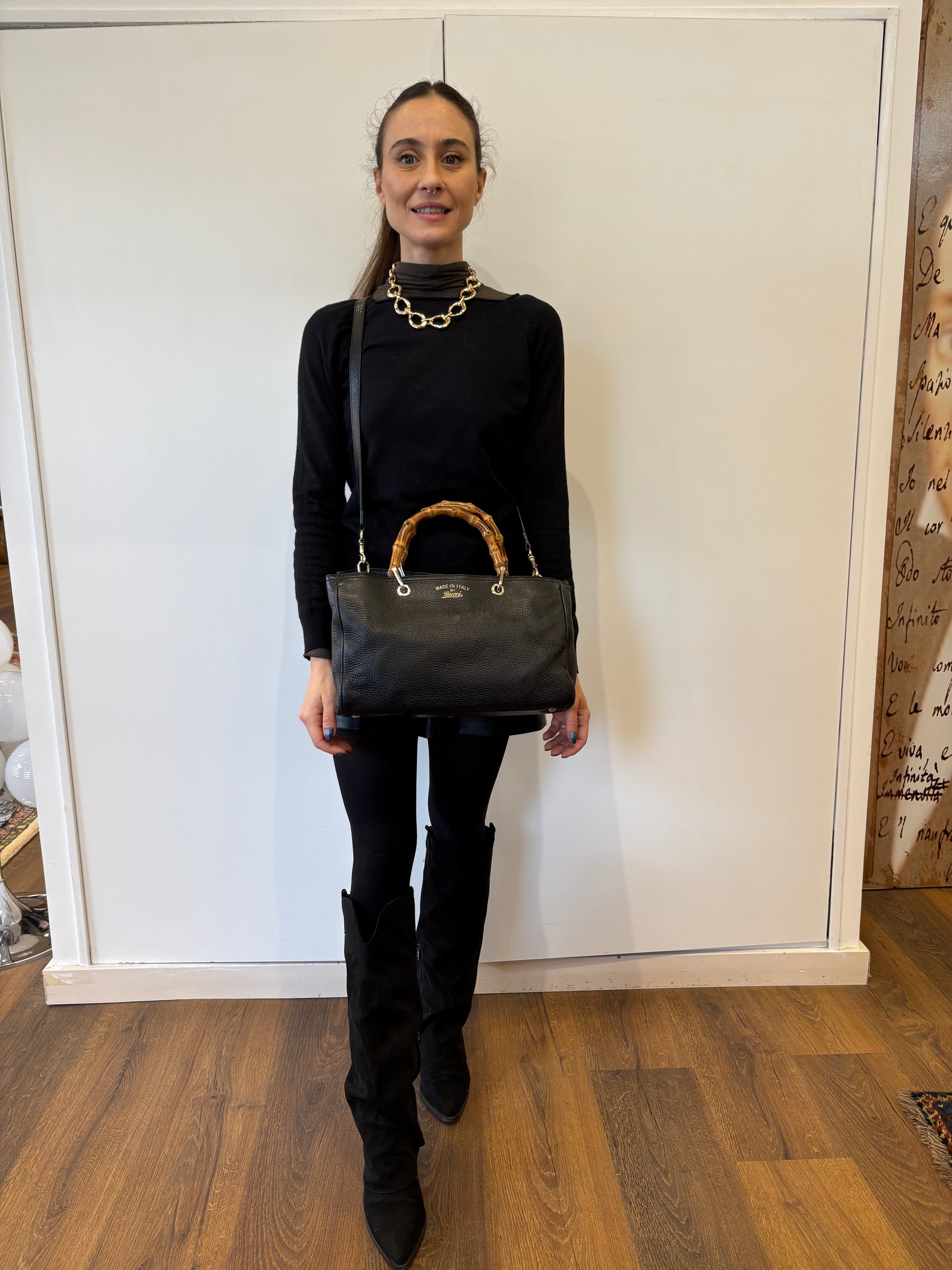 Gucci Bamboo Shopper, un modello iconico della maison che combina il design moderno di una tote bag con i manici storici in bambù, simbolo distintivo del marchio fin dal 1947.