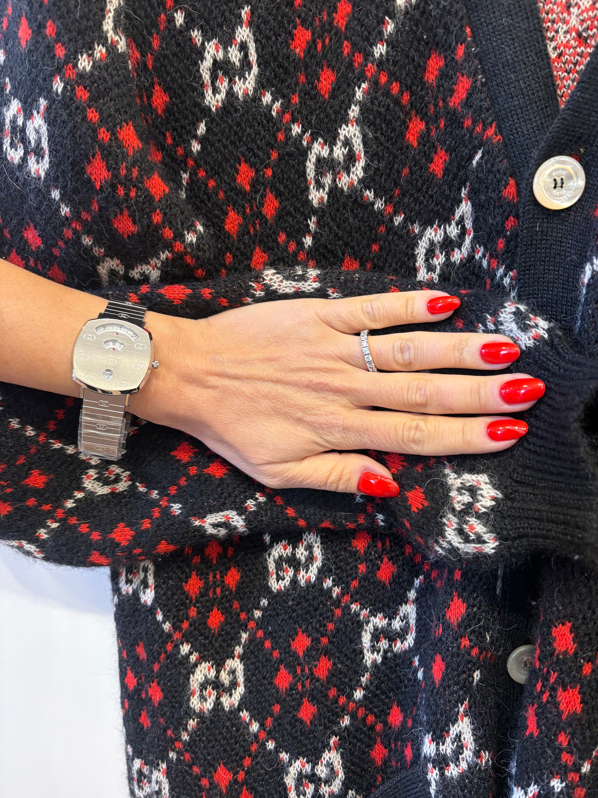 Gucci Grip con cassa e bracciale in acciaio inossidabile con motivo GG inciso, orologio da polso unisex che si distingue per il suo design ispirato al mondo dello skateboard, presenta un display a disco rotante anziché le tradizionali lancette. Cassa e bracciale sono realizzati in acciaio inossidabile, movimento alimentato da un affidabile movimento al quarzo Swiss Made, il quadrante presenta tre piccole aperture che indicano rispettivamente l'ora, i minuti e la data.