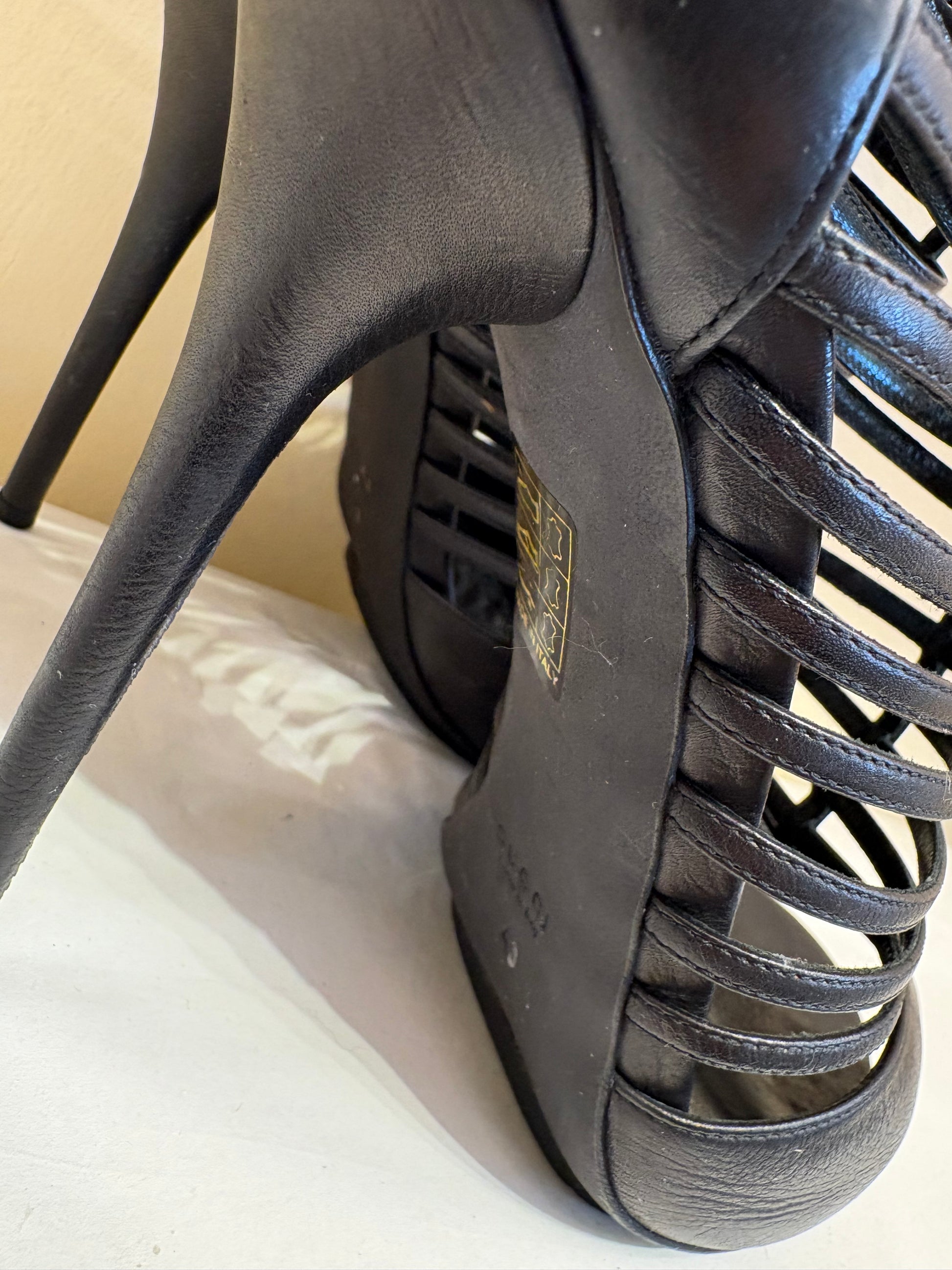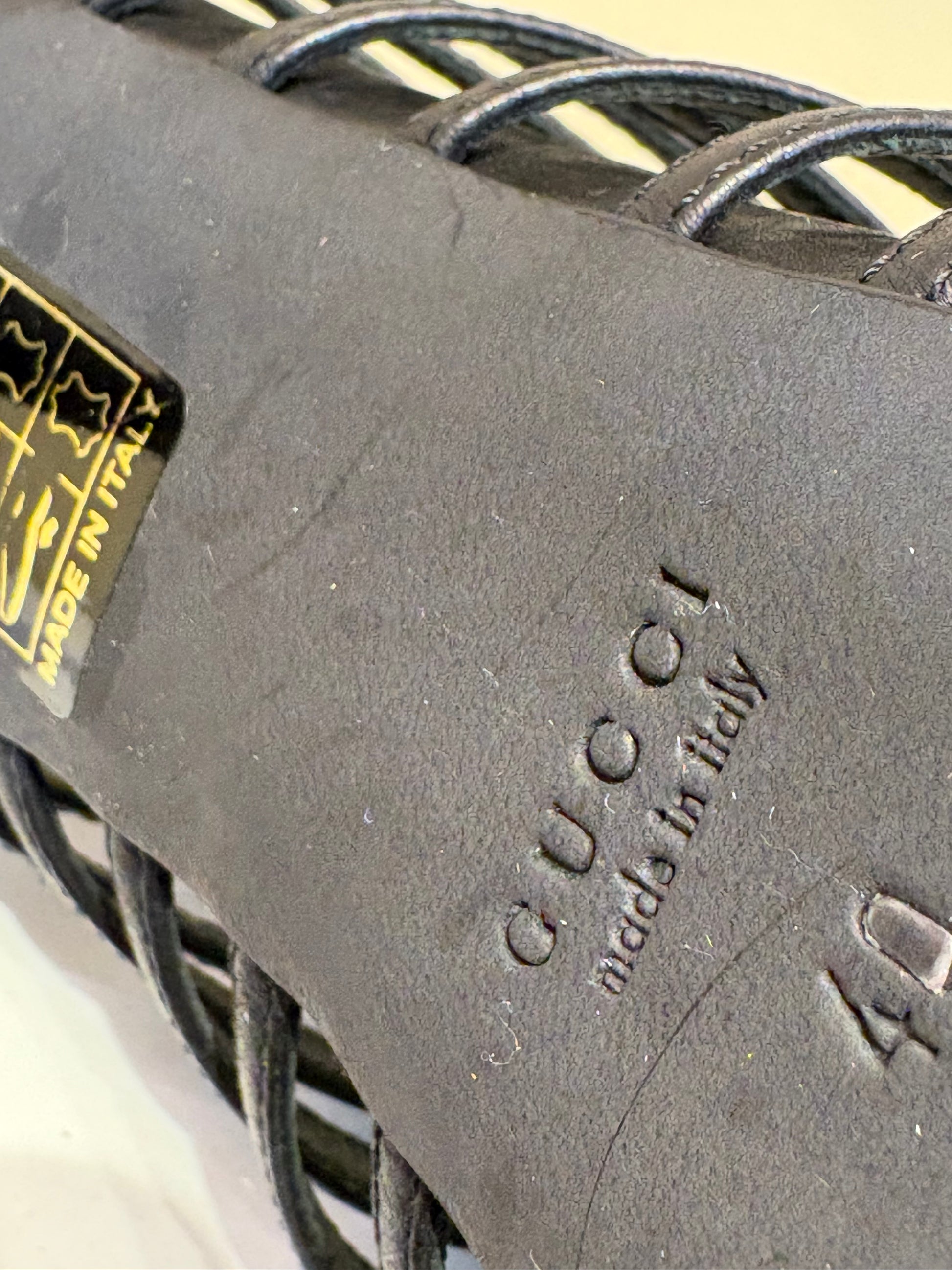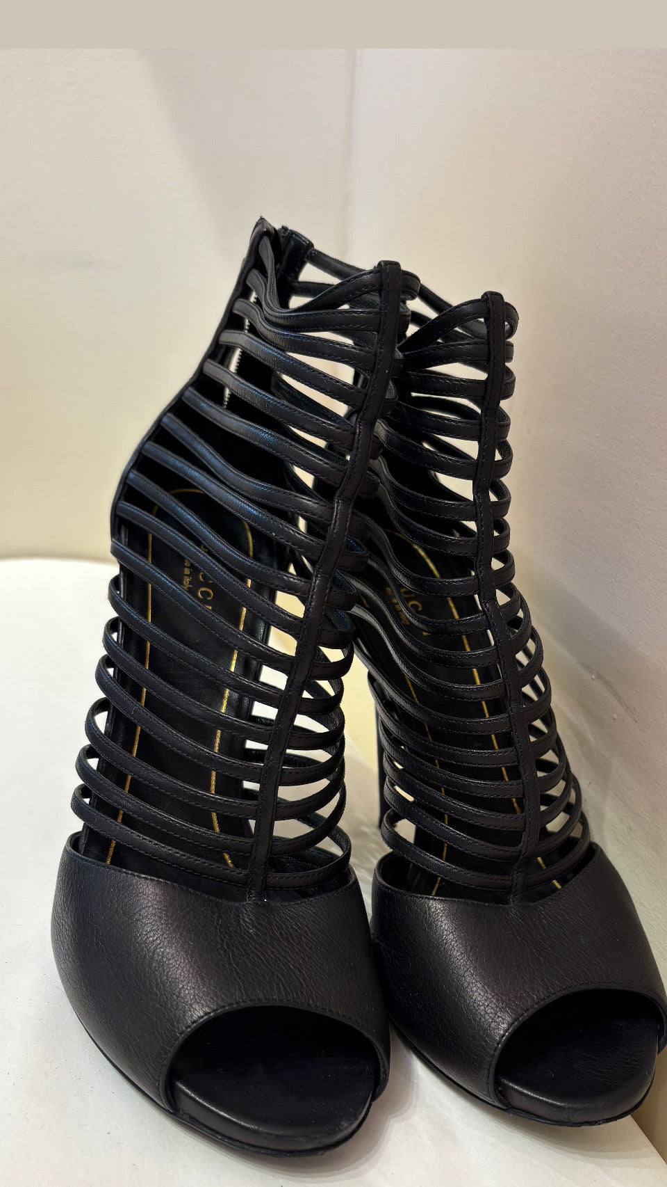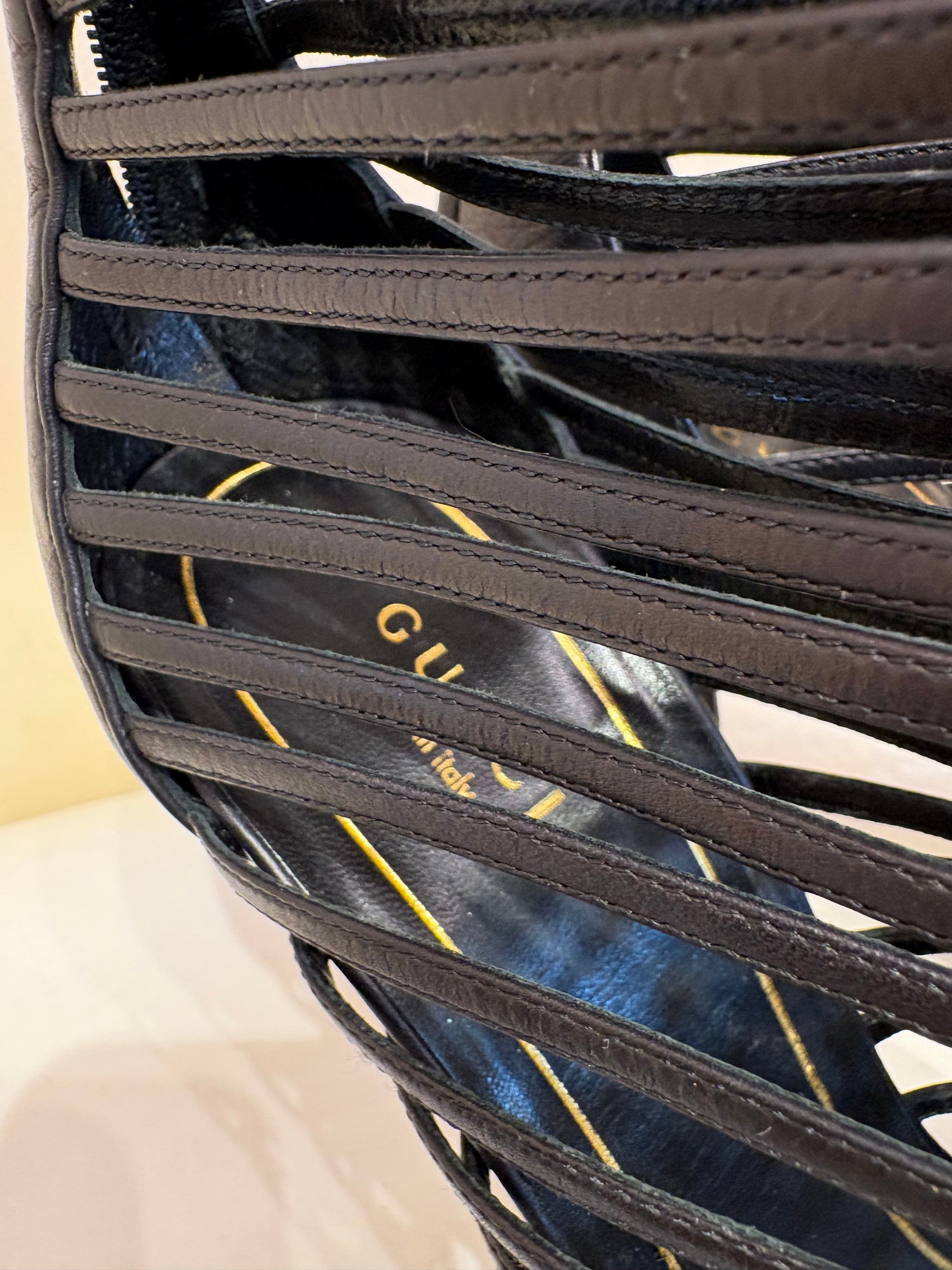 Stupendi sandali in pelle Gucci colore testa di moro con stringhe , tacchi sottili altezza cm 12 , accenno di plateau davanti cm 2 nascosto dalla fascetta sul dorso del piede