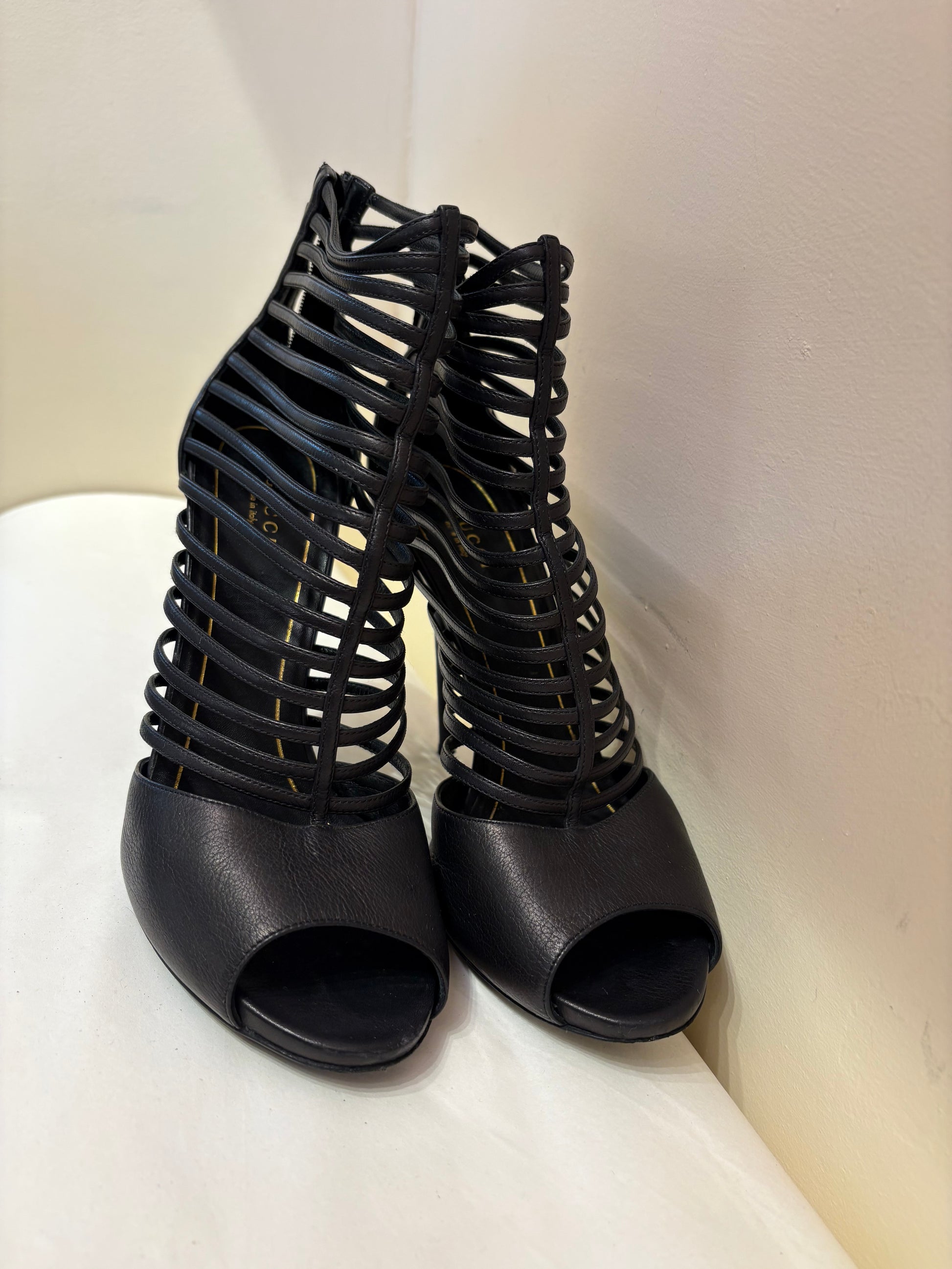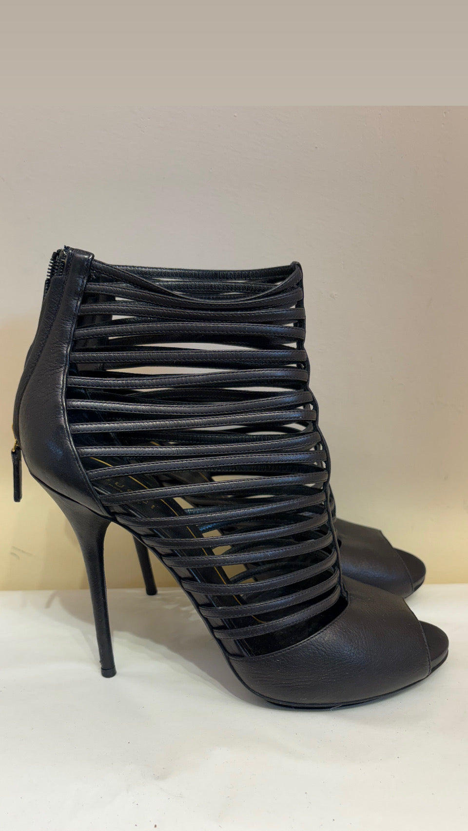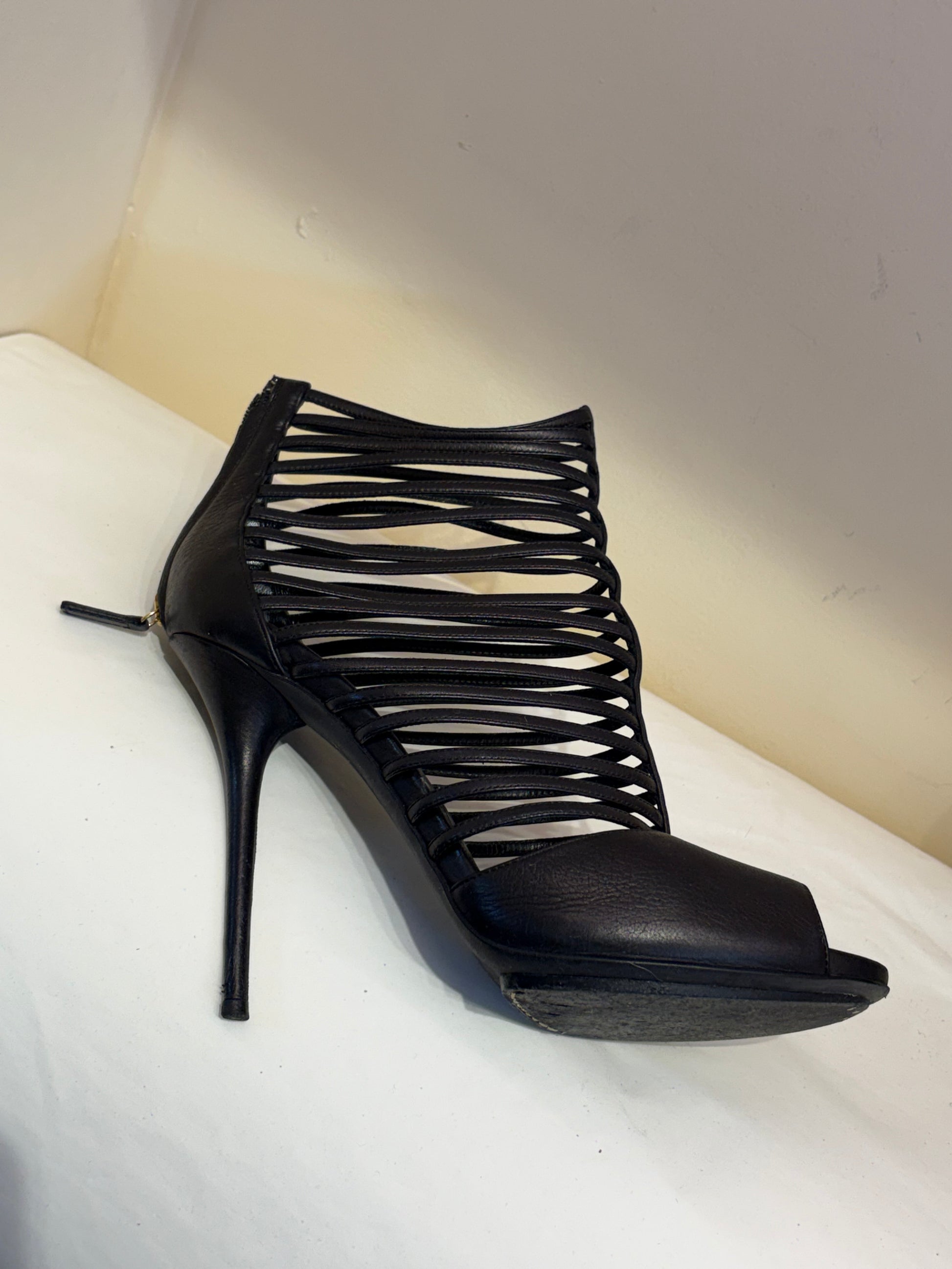 Stupendi sandali in pelle Gucci colore testa di moro con stringhe , tacchi sottili altezza cm 12 , accenno di plateau davanti cm 2 nascosto dalla fascetta sul dorso del piede