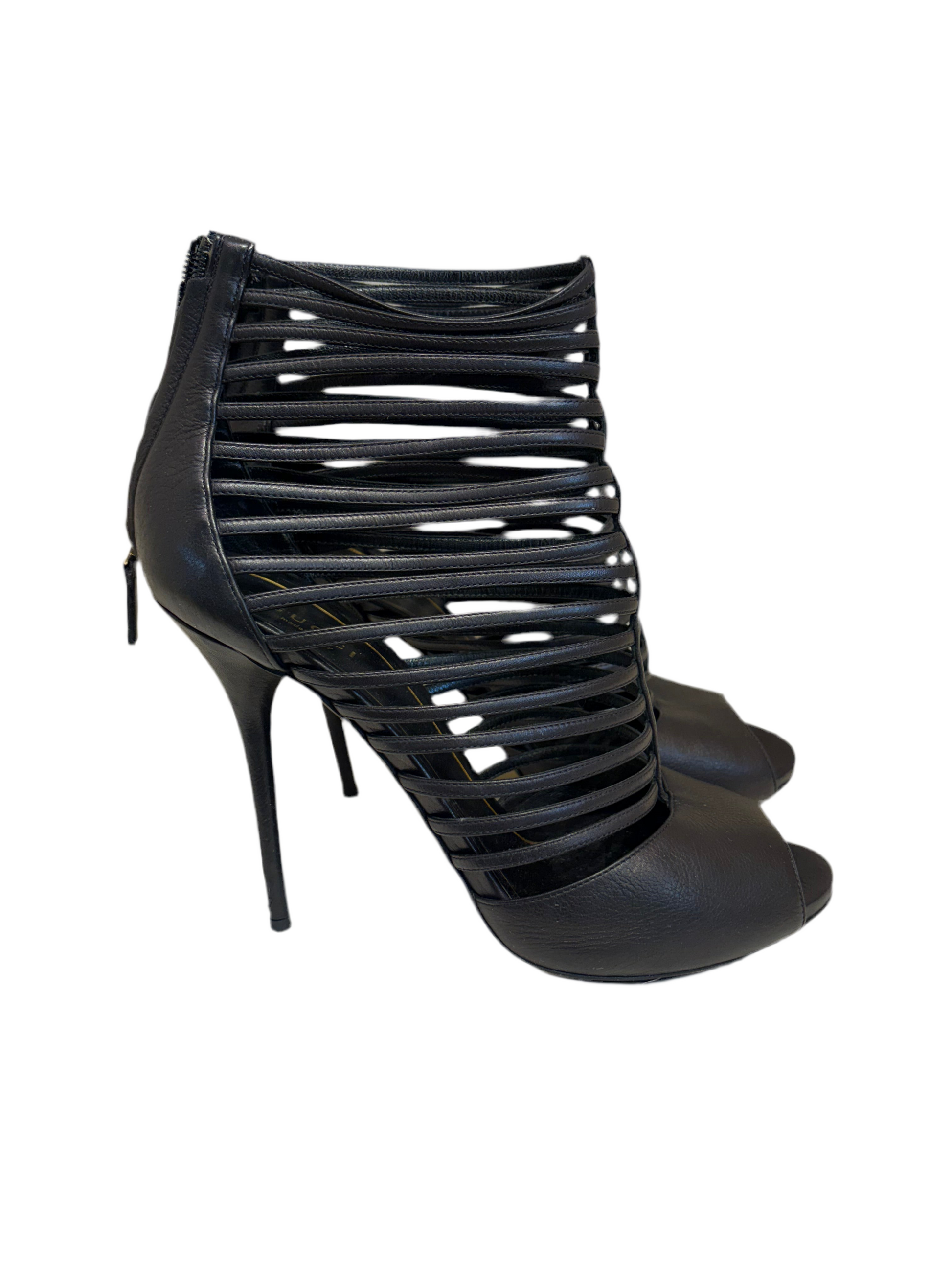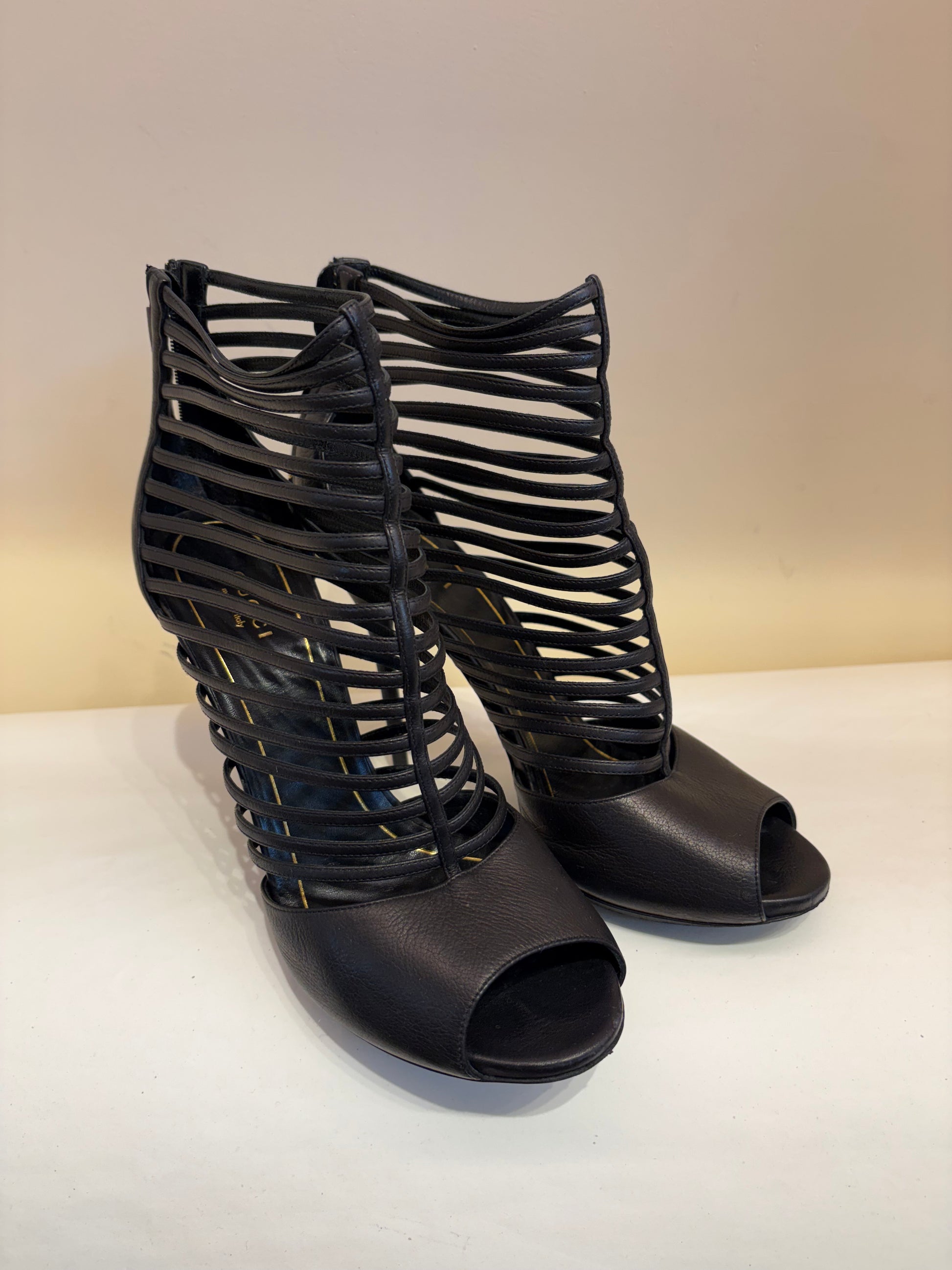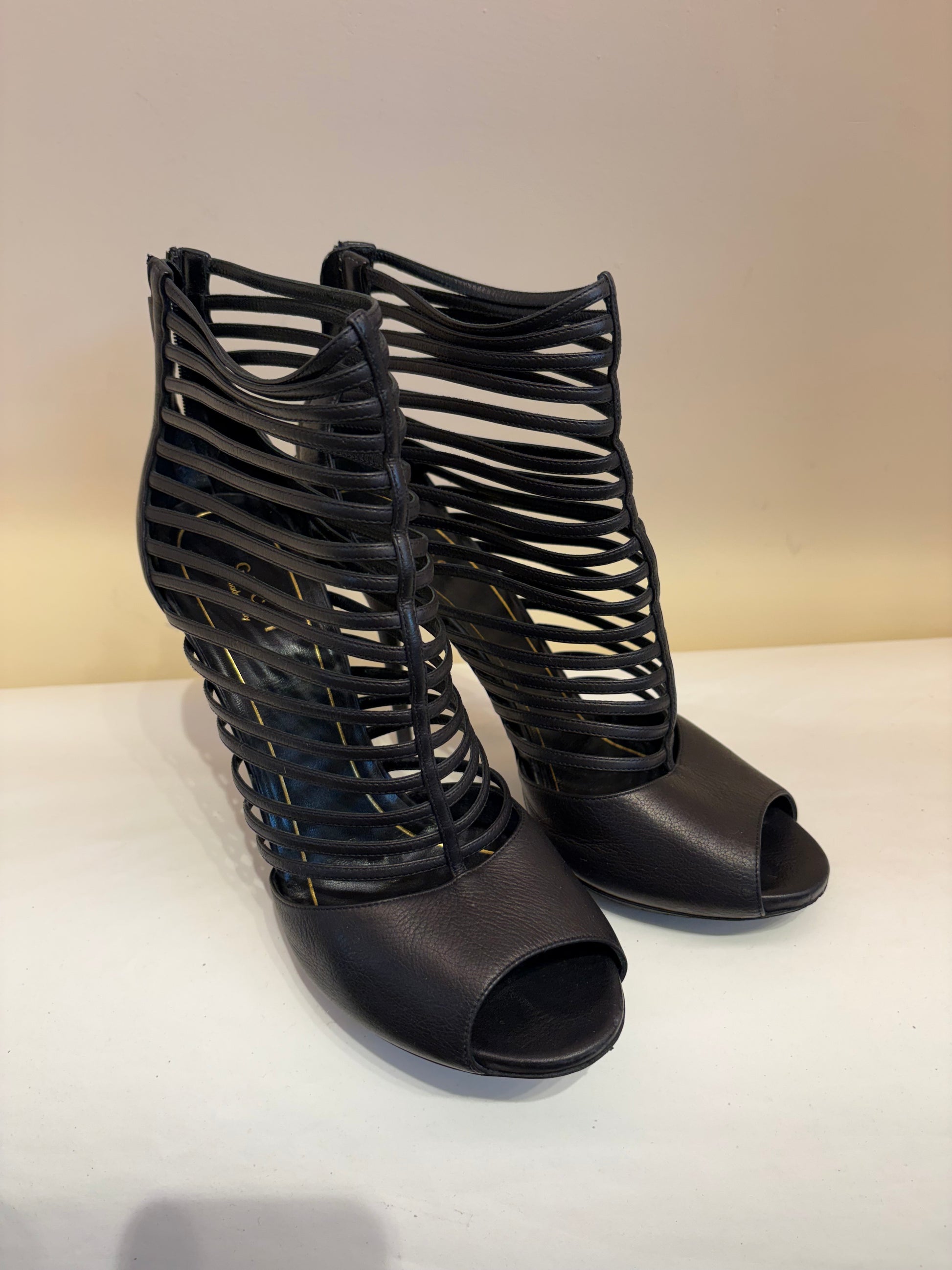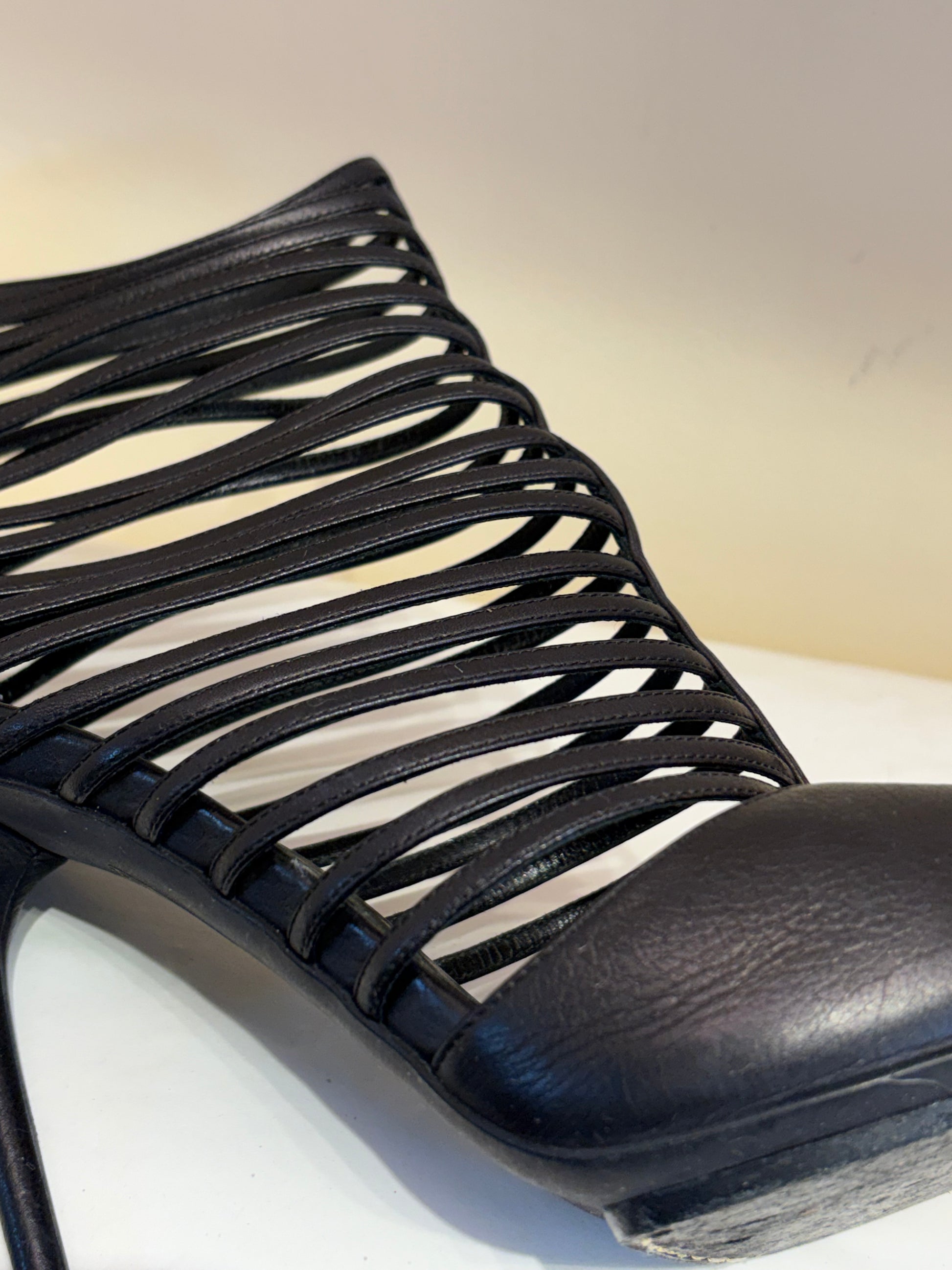 Stupendi sandali in pelle Gucci colore testa di moro con stringhe , tacchi sottili altezza cm 12 , accenno di plateau davanti cm 2 nascosto dalla fascetta sul dorso del piede