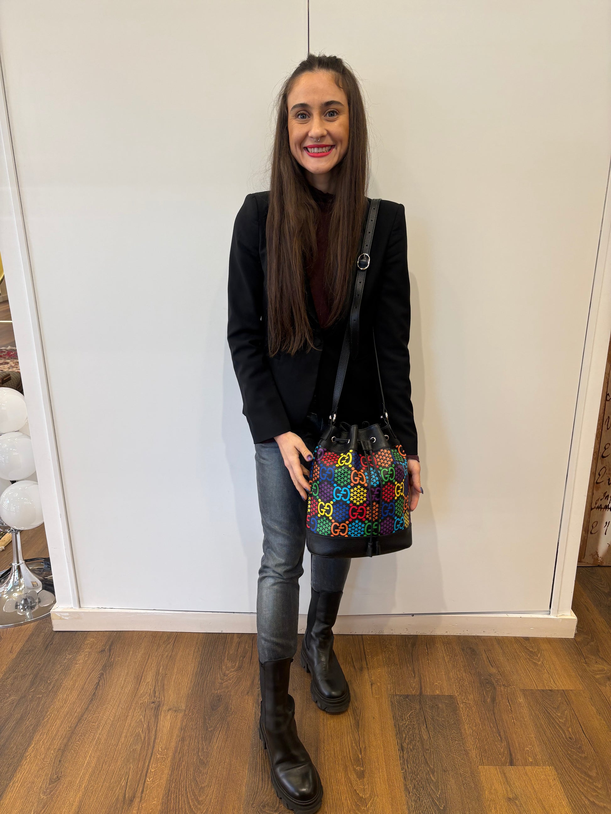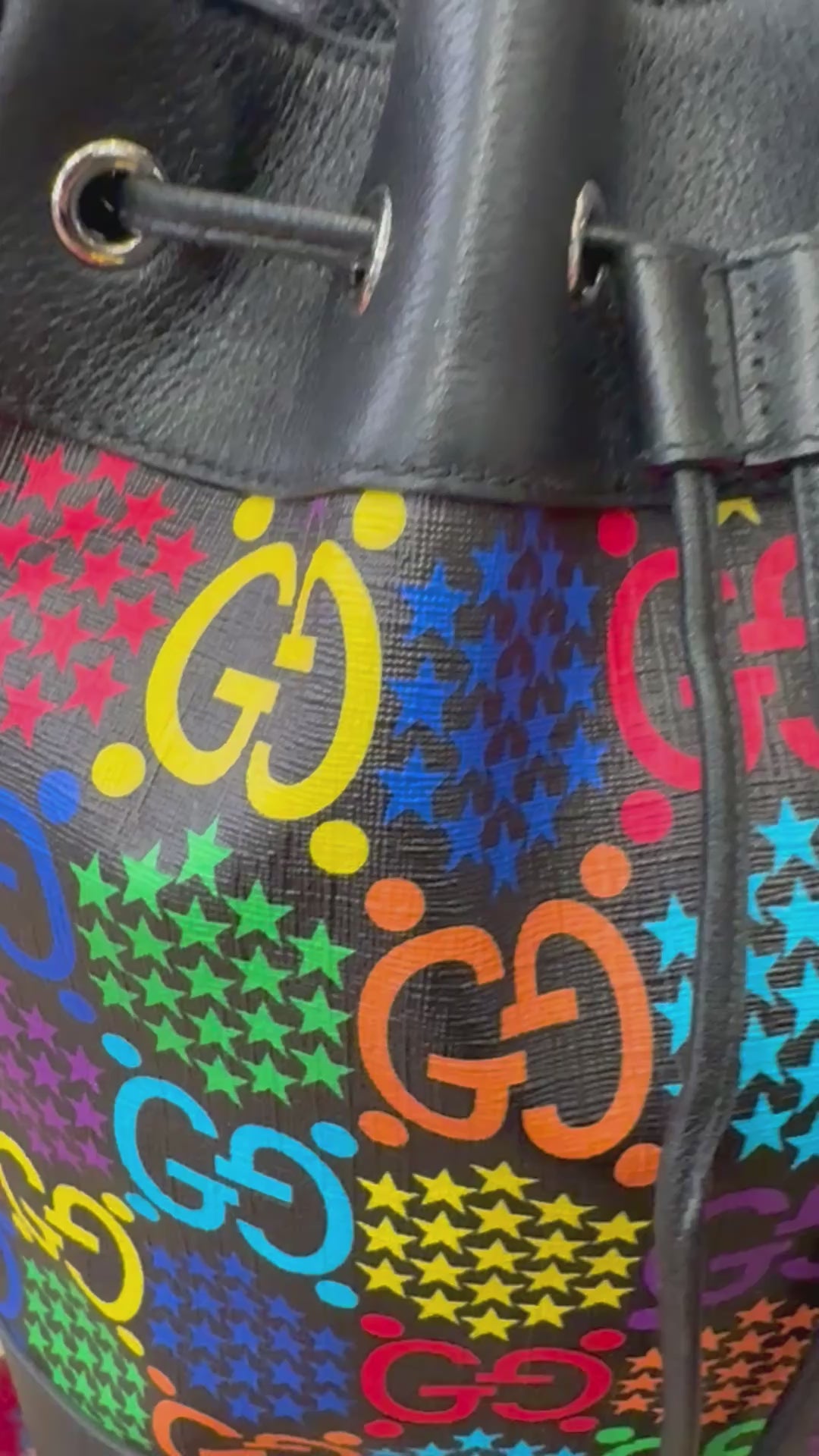 Gucci GG Supreme Psychedelic Bucket Bag, un pezzo iconico introdotto per la collezione Cruise 2020. Il design presenta una rivisitazione moderna e colorata del classico monogramma GG, arricchita da stelle multicolori che creano un vivace effetto ologramma sulla tela rivestita.