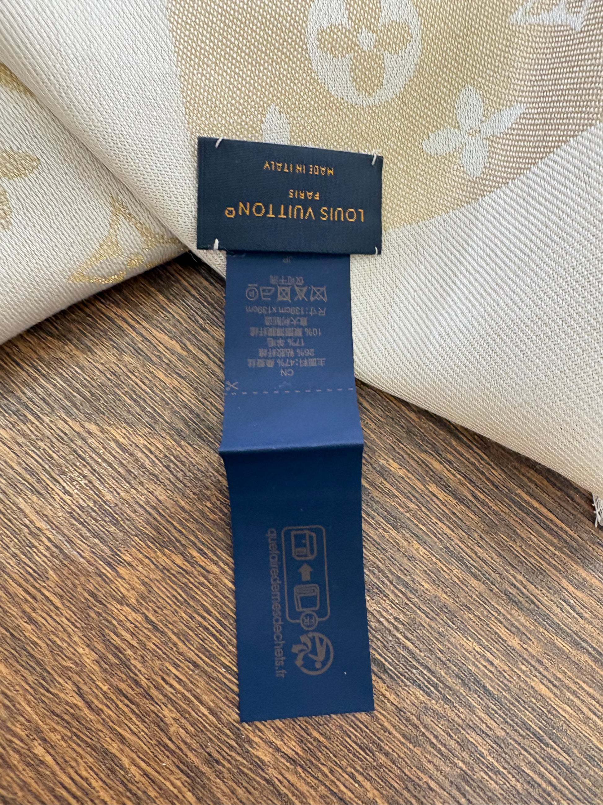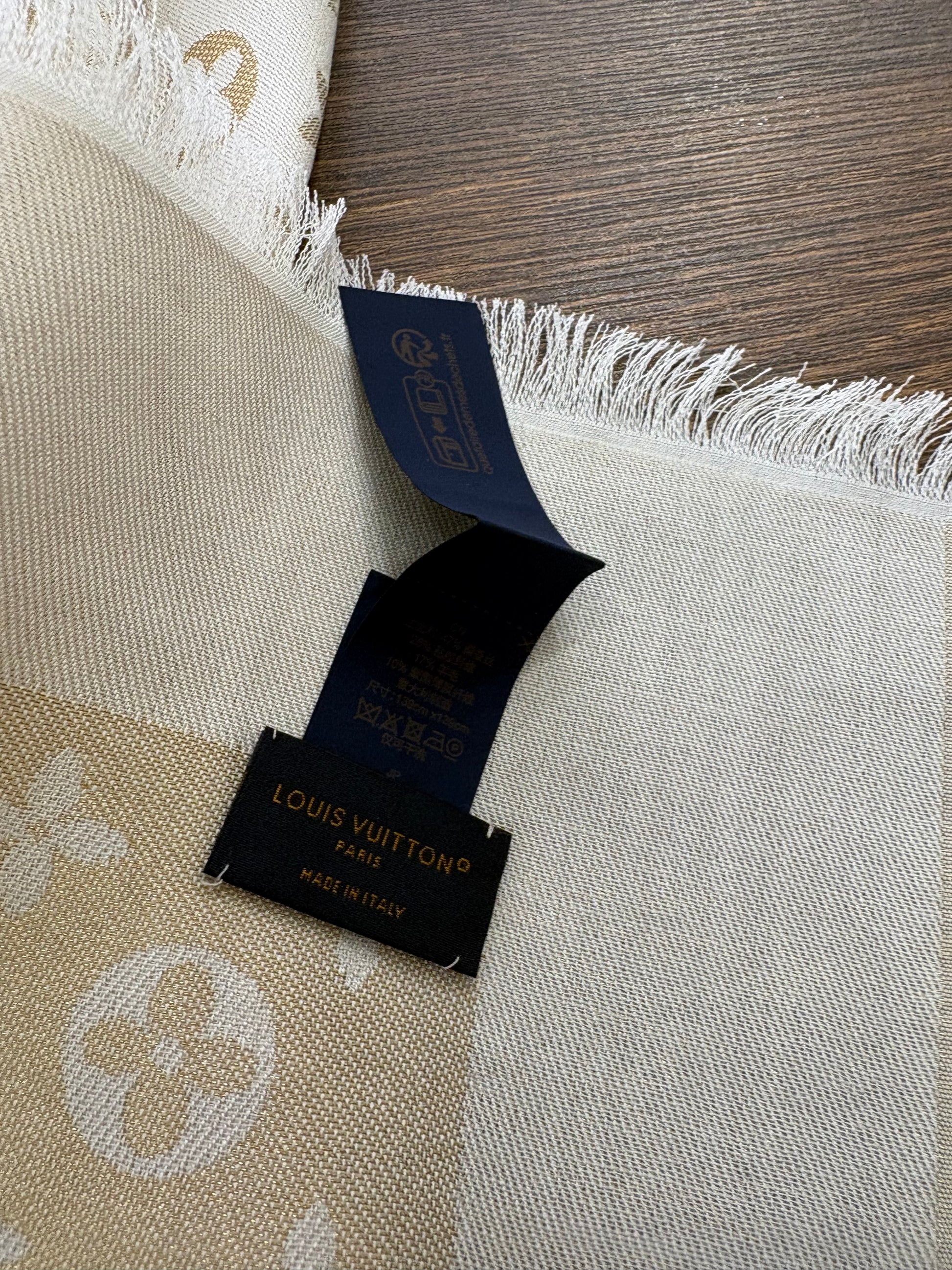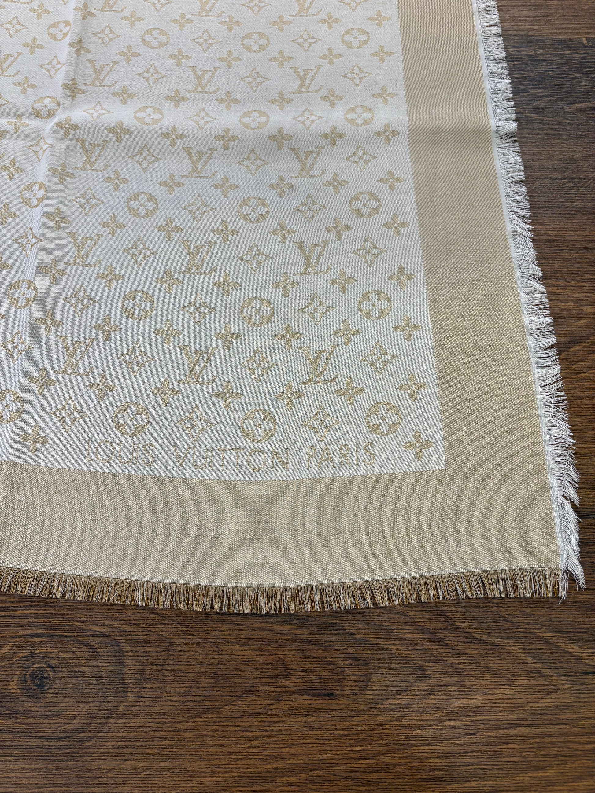- Finiture: Lo scialle è rifinito con un elegante bordo sfrangiato e la firma Louis Vuitton intessuta.