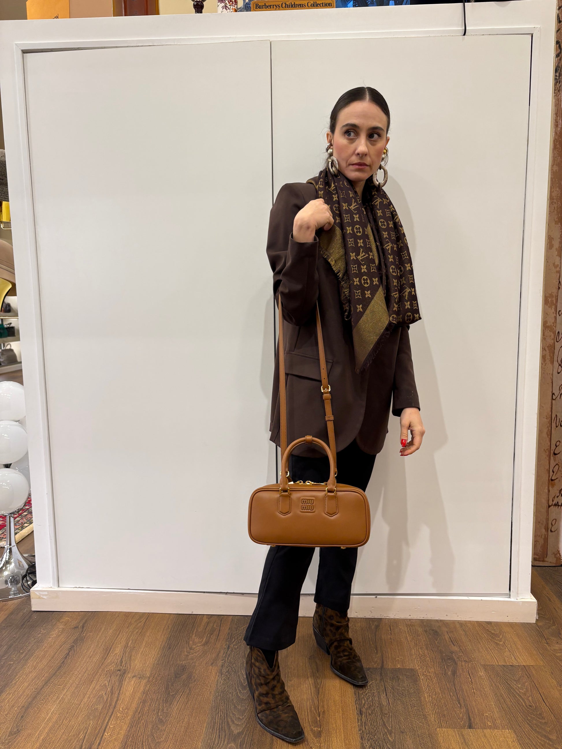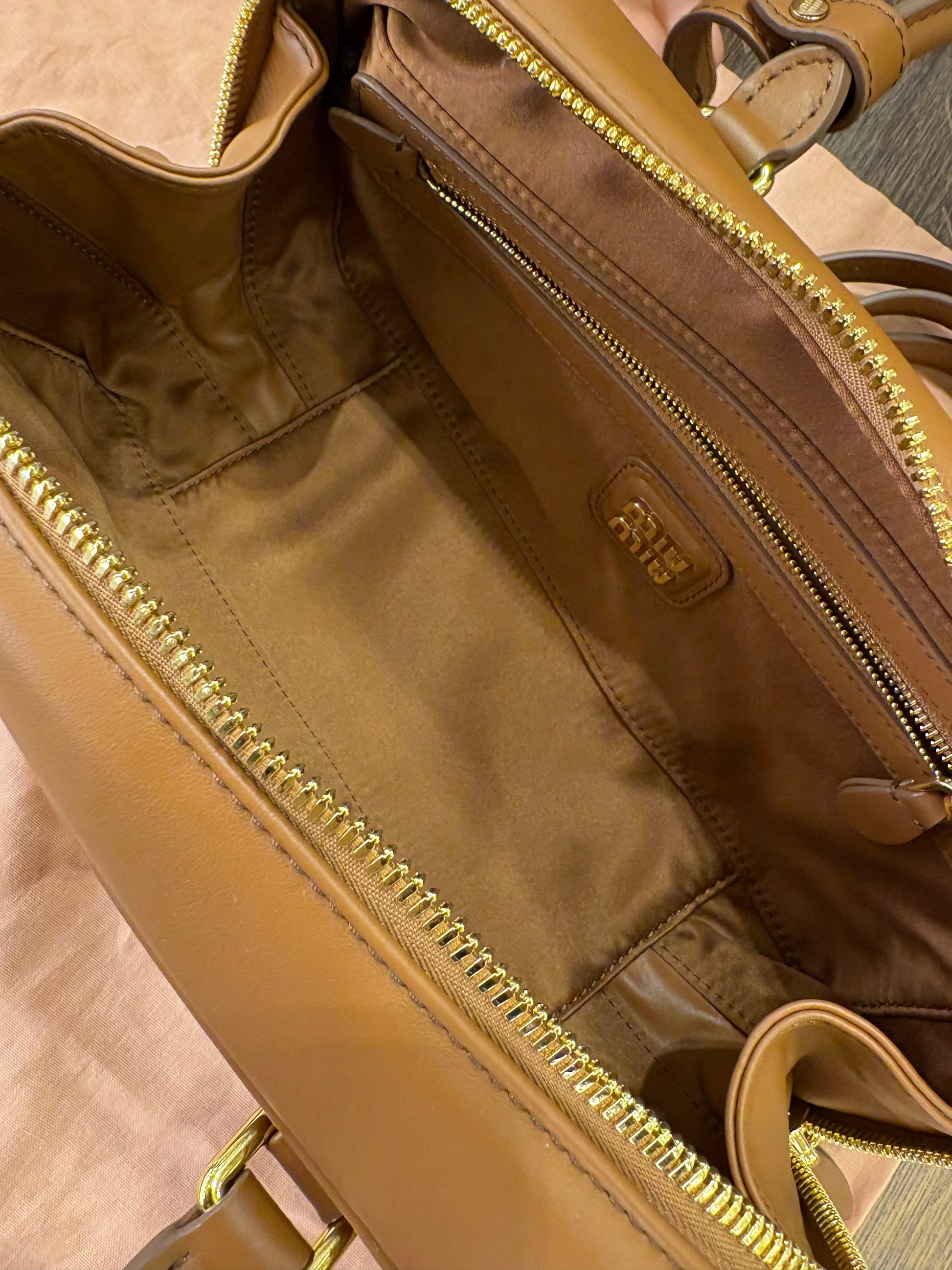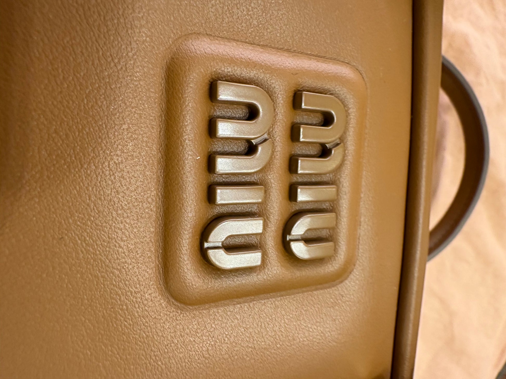 Miu Miu Arcadie, un modello iconico caratterizzato da una silhouette "bowling" strutturata e dal logo lettering metallico applicato sul davanti.