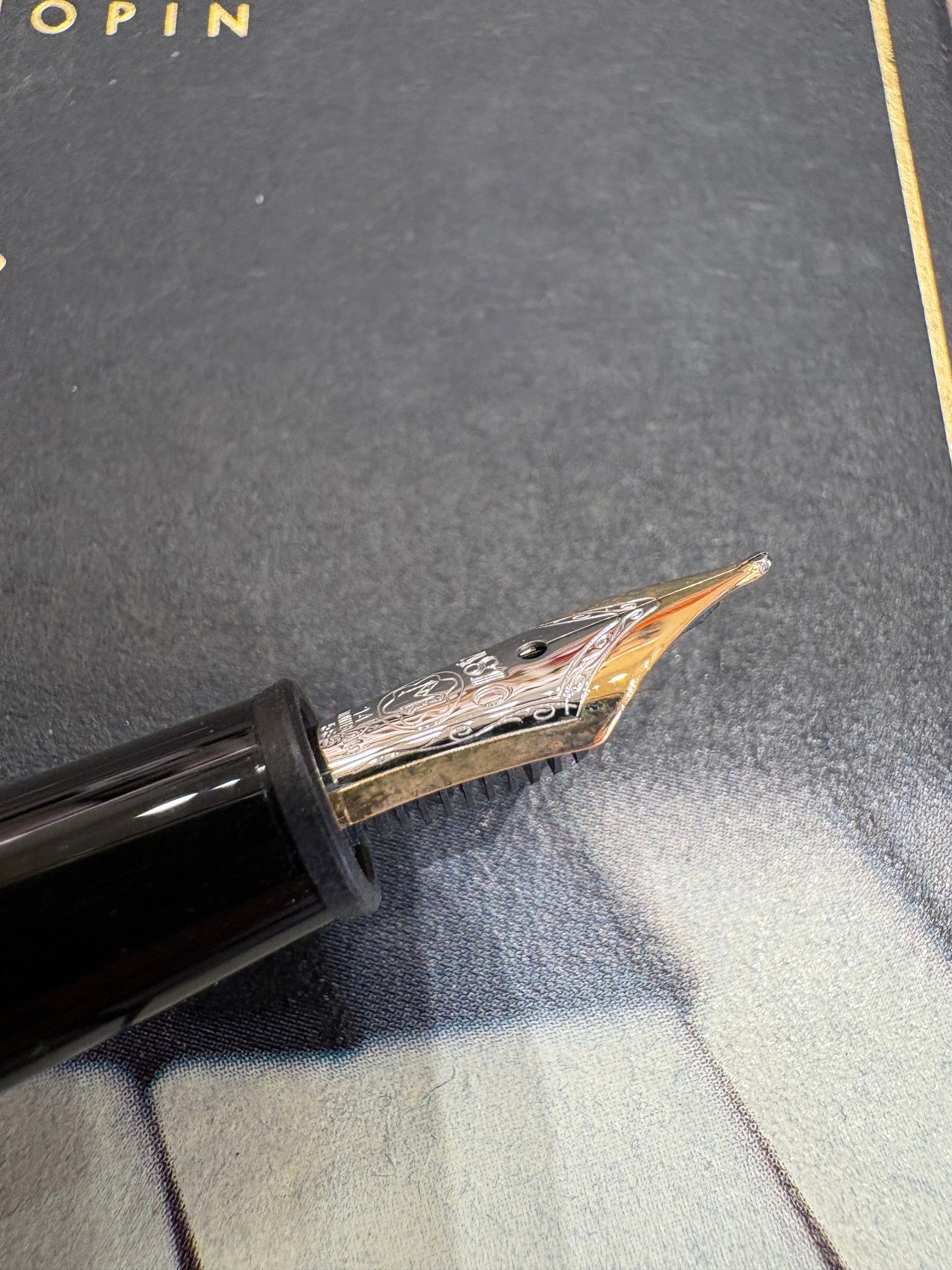 - Montblanc collezione "Donation Pen" di Montblanc, dedicata a grandi musicisti.La penna è realizzata in pregiata resina nera con dettagli in platino.Il pennino è in oro 585 bicolore lavorato a mano e riporta un ritratto di Frédéric Chopin.