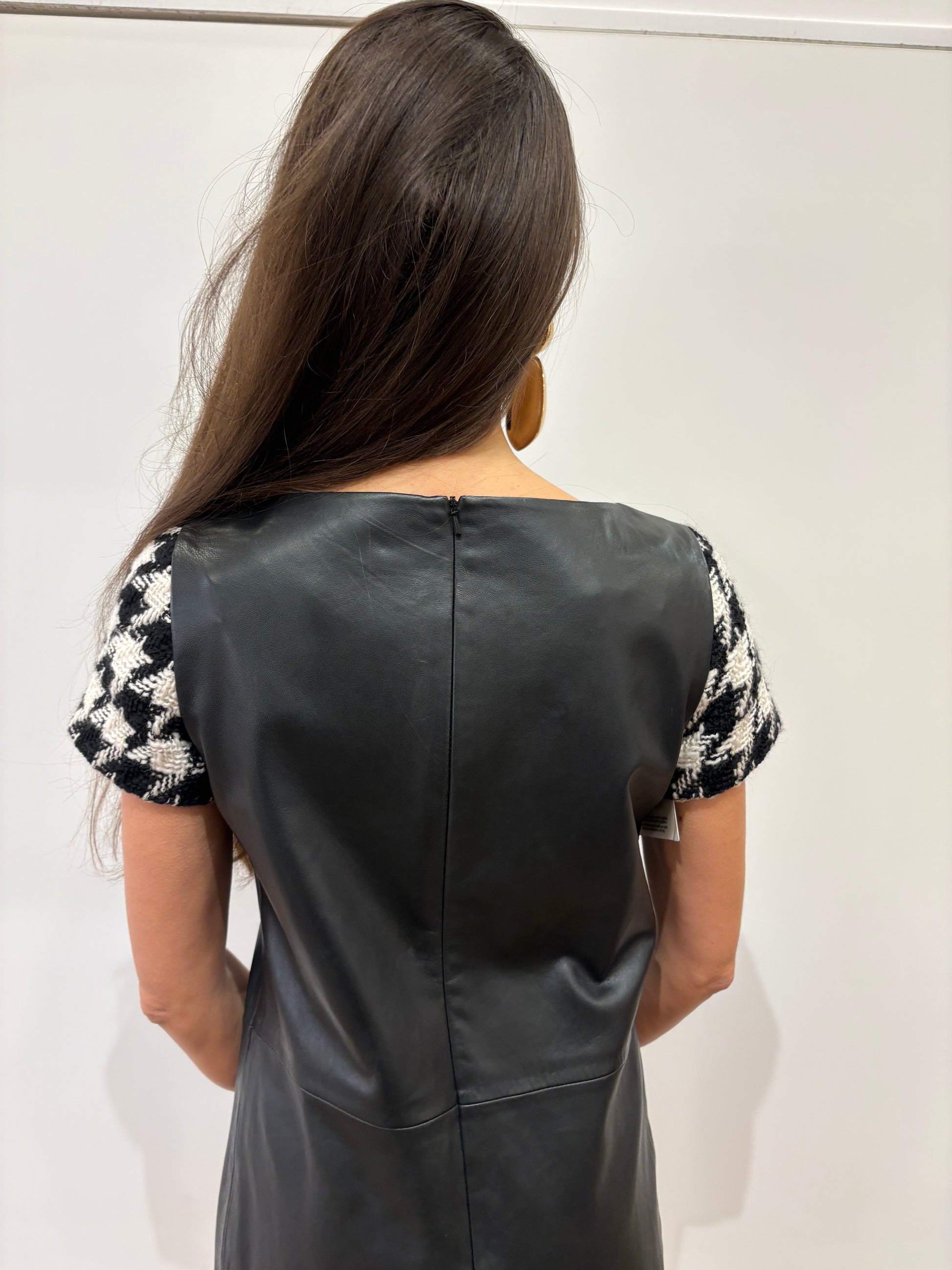 Moschino Boutique abito in pelle nero maniche corte in lana stampa pied de poule. Taglio dritto non avvitato