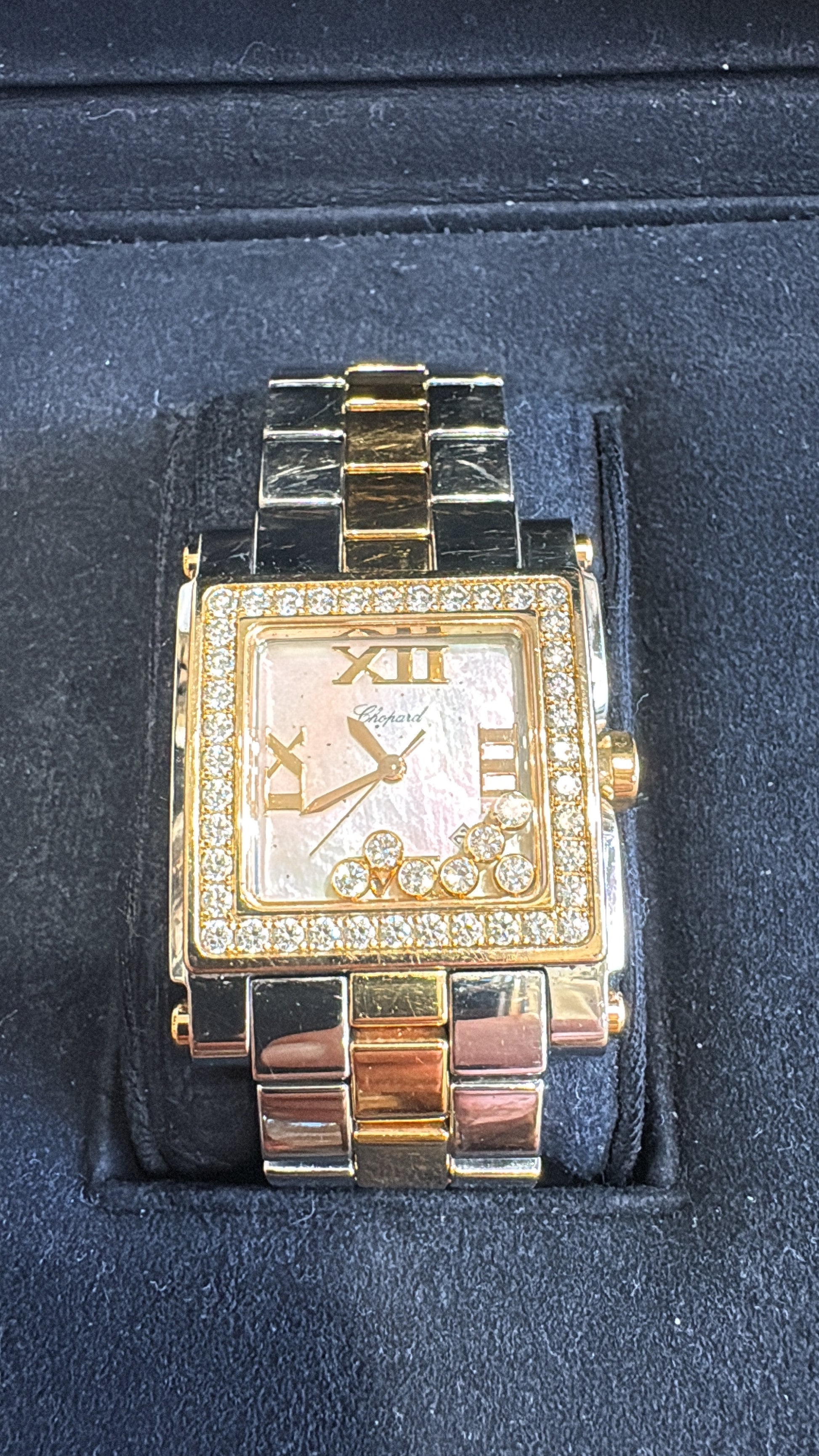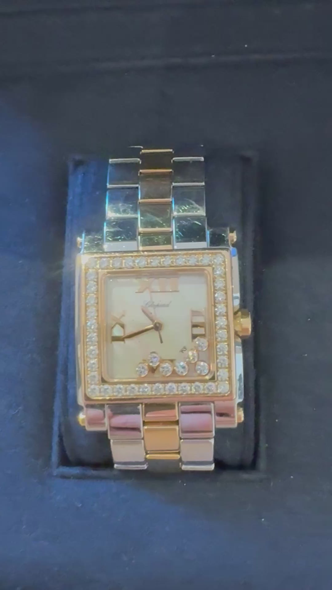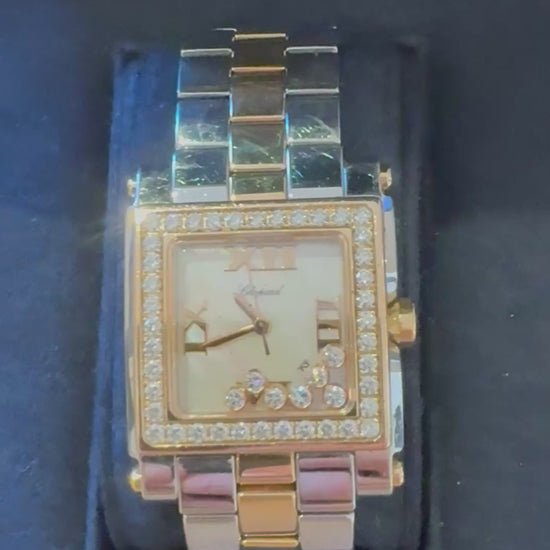 Orologio Chopard Happy Sport con diamanti, acciaio e oro rosa 18k Sette diamanti fluttuanti taglio brillante. Quadrante quadrato in oro rosa 18 carati con finitura lucida. cinturino in acciaio e oro rosa 18k Movimento al quarzo. Carica in vetro zaffiro e vetro zaffiro antigraffio. Dimensioni: 38 mm x 29 mm di fronte