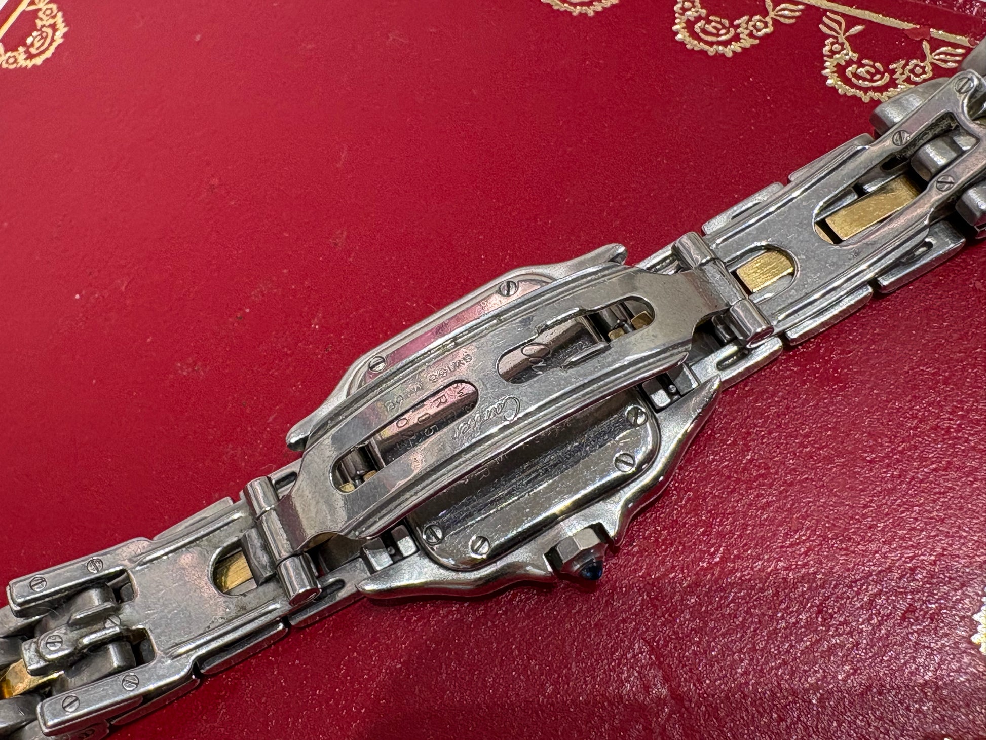 Orologio Panthère de Cartier , modello piccolo movimento a quarzo , cassa in oro giallo 750/1000 e acciaio , dimensioni 23x30mm , spessore 6 mm, corona ornata di uno spinello blu sintetico , quandrante argentato , lancette a forma di gladio d’acciaio azzurrato , bracciale in oro giallo 750/1000 e acciaio , impermeabile fino a 30 mt