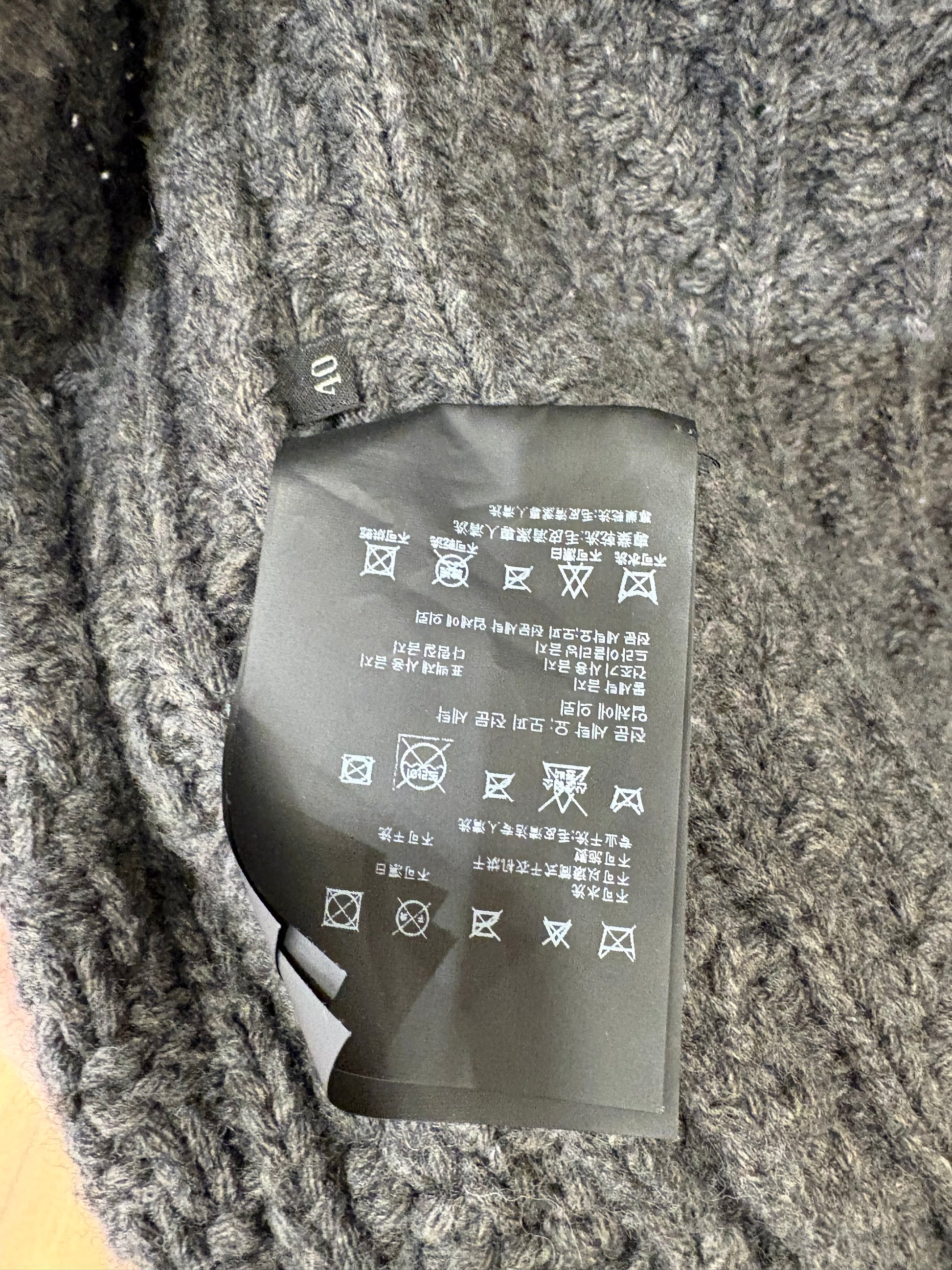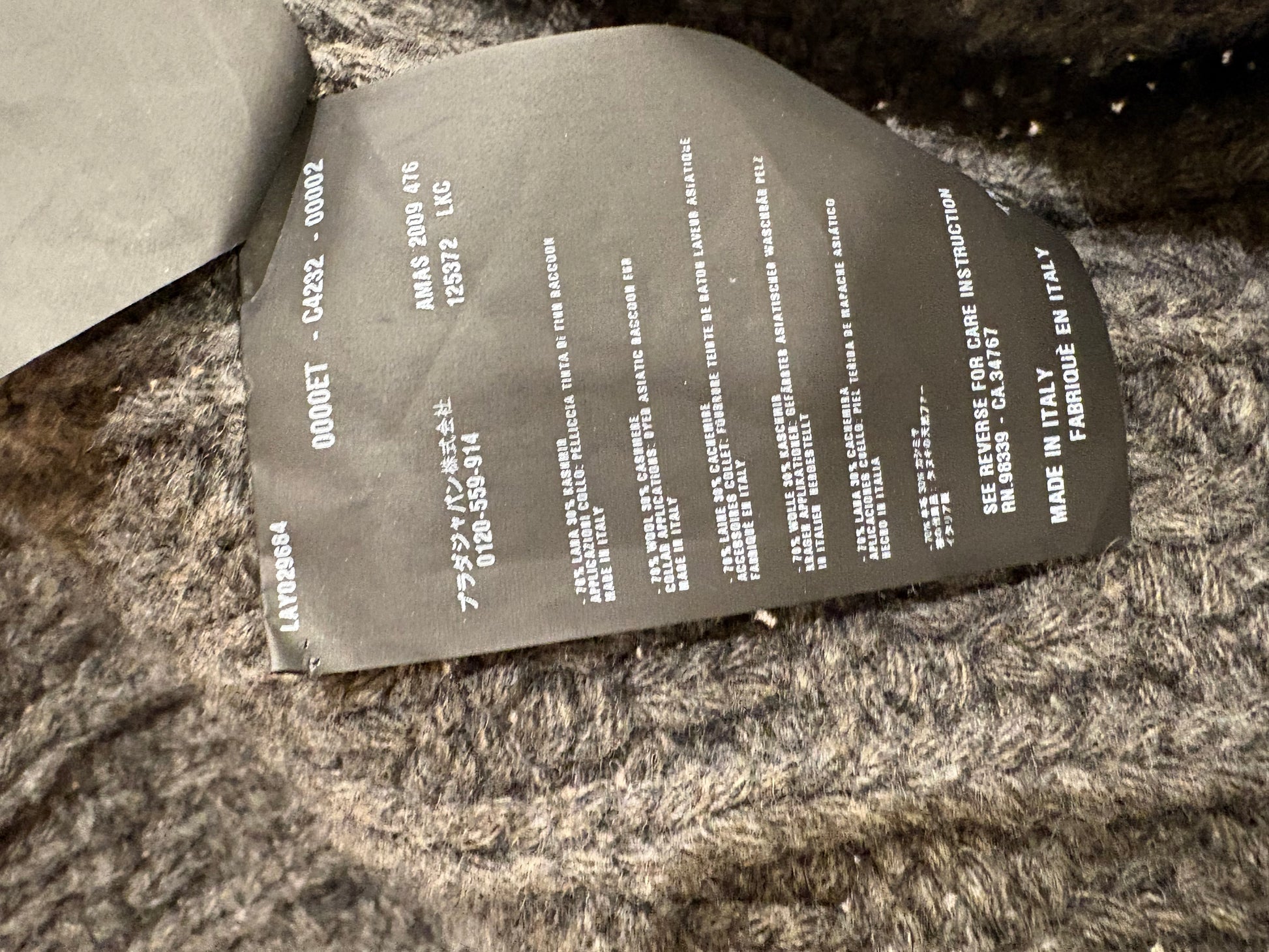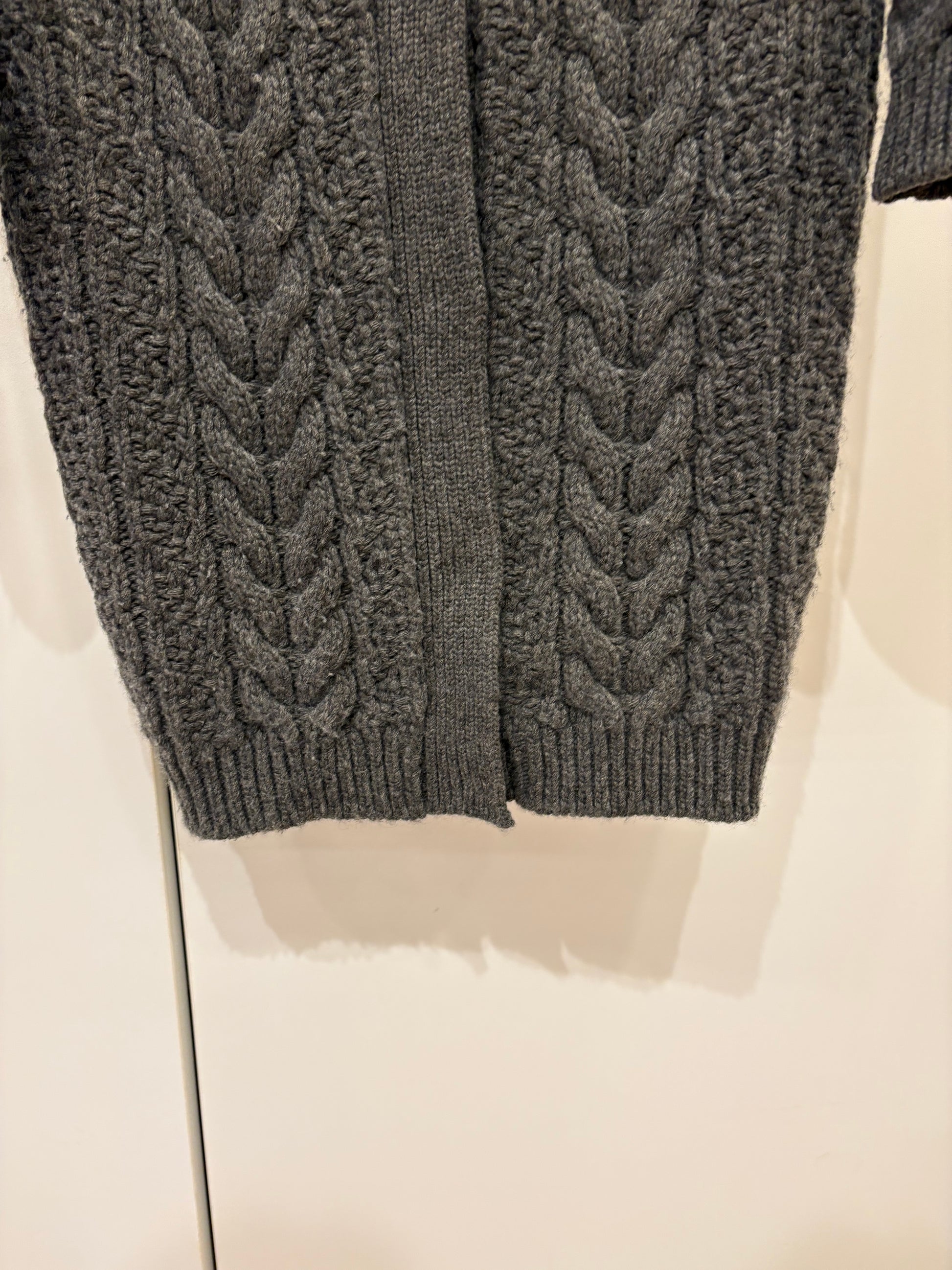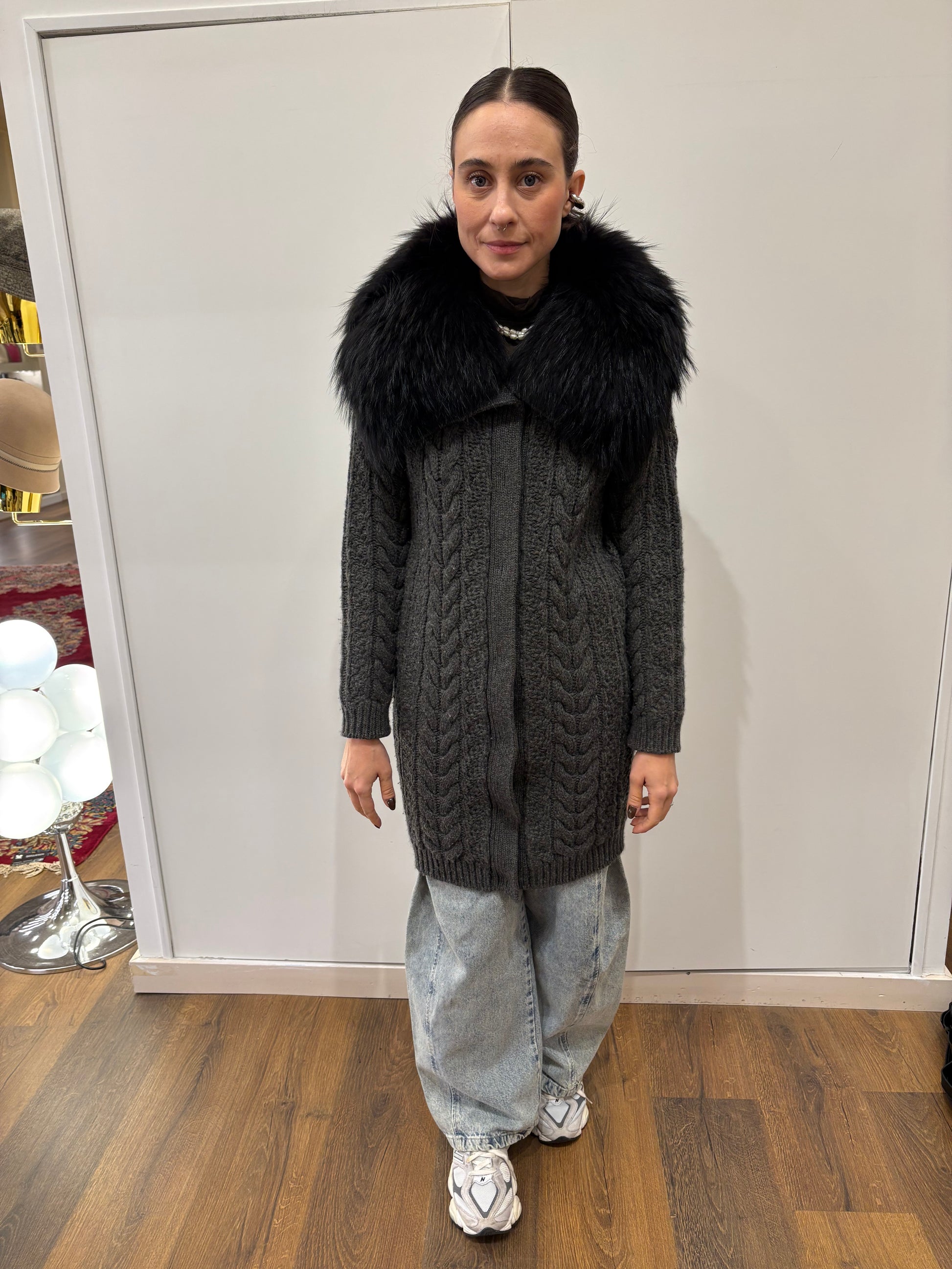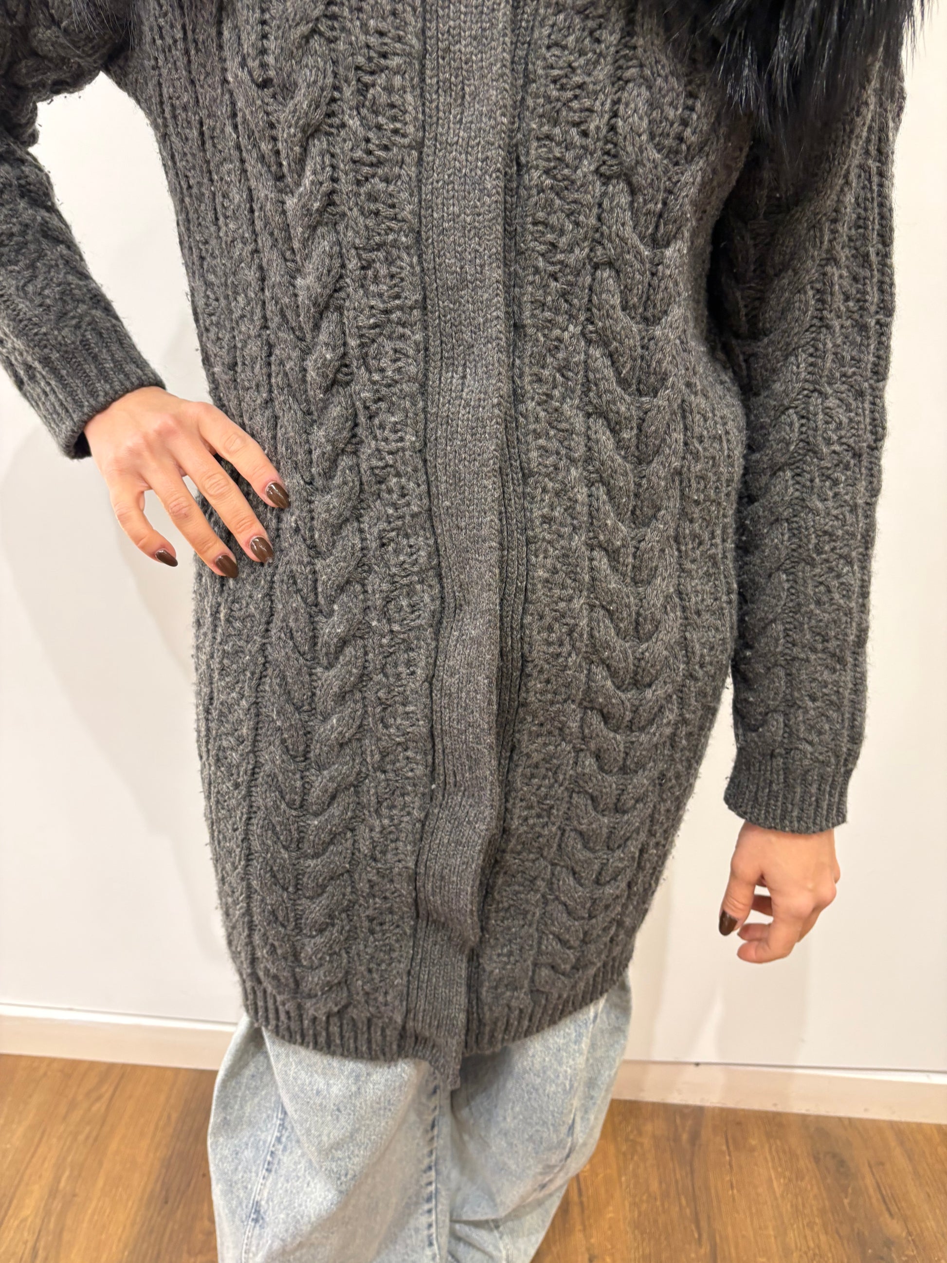 Cappottino in pura lana Prada motivi a trecce colore grigio scuro e collo voluminoso in vera pelliccia di volpe