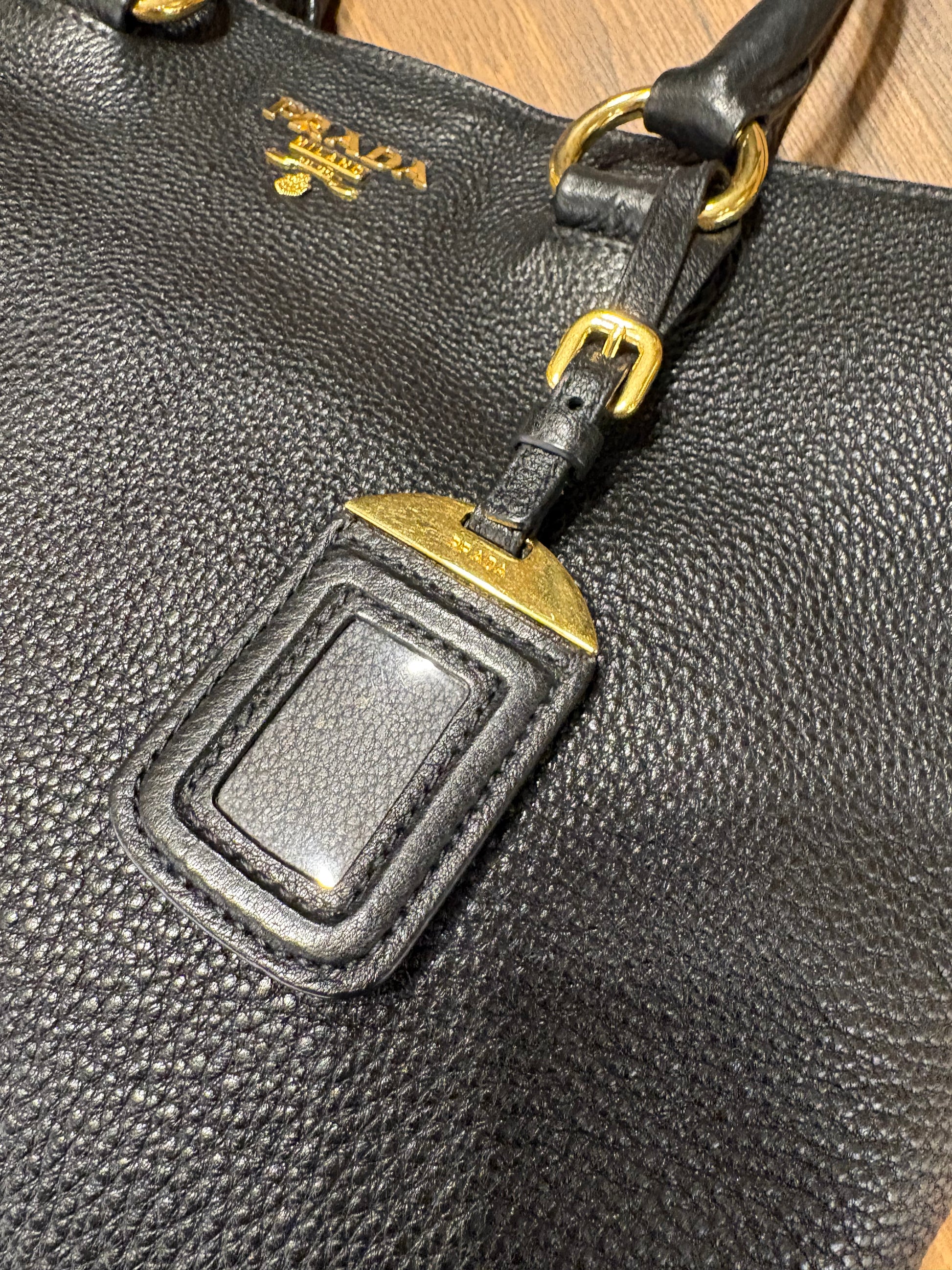 borsa tote Prada in pelle martellata nera (spesso identificata come Vitello Daino o Vitello Phenix). Questo stile è versatile e può essere portato a mano o a spalla grazie alla tracolla rimovibile.