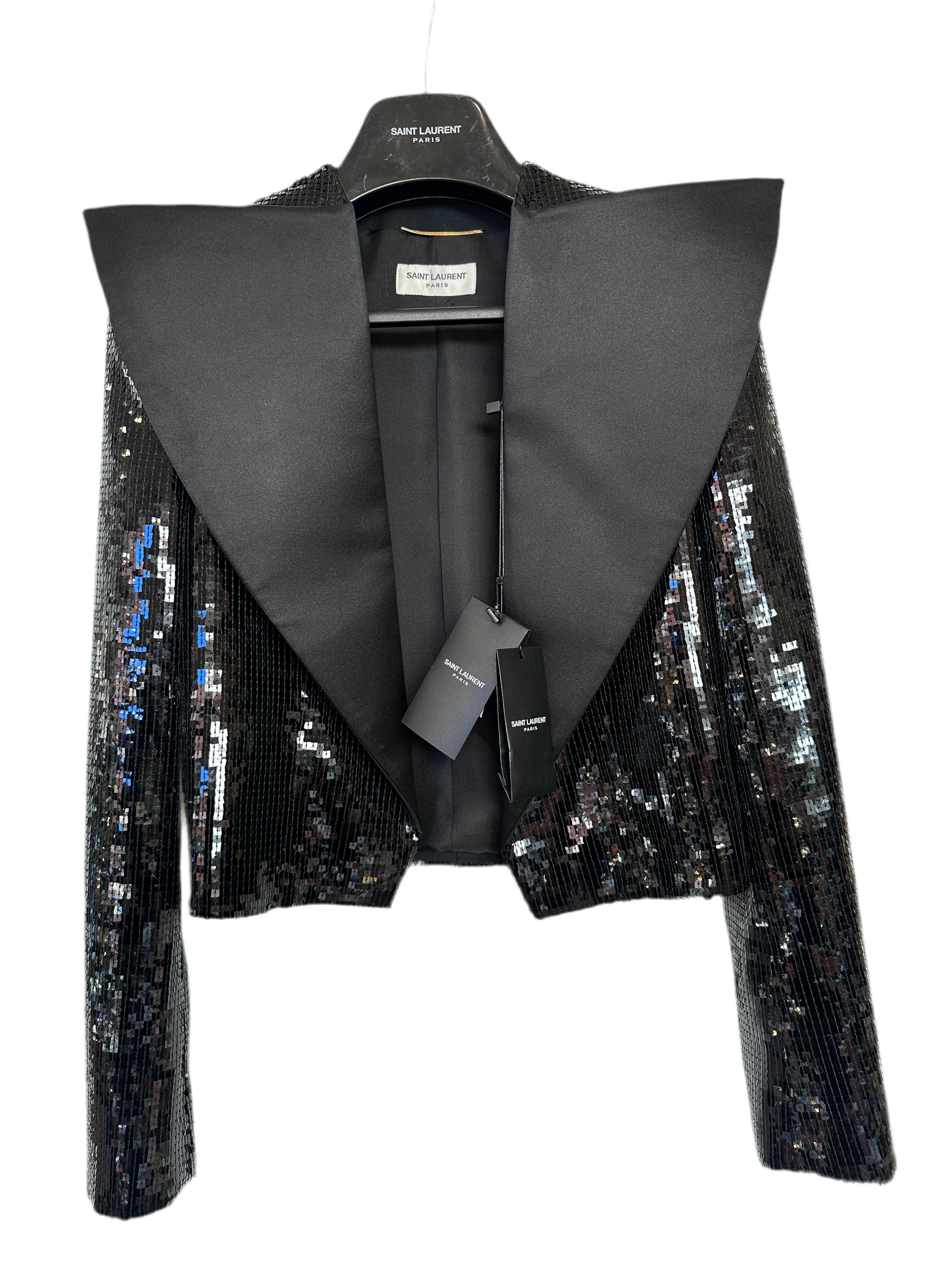 Giacca corta taglio smoking nero revers in seta e struttura in paillettes Senza abbottonatura . Vestibilita ‘ molto piccola perfetta per la tg38
