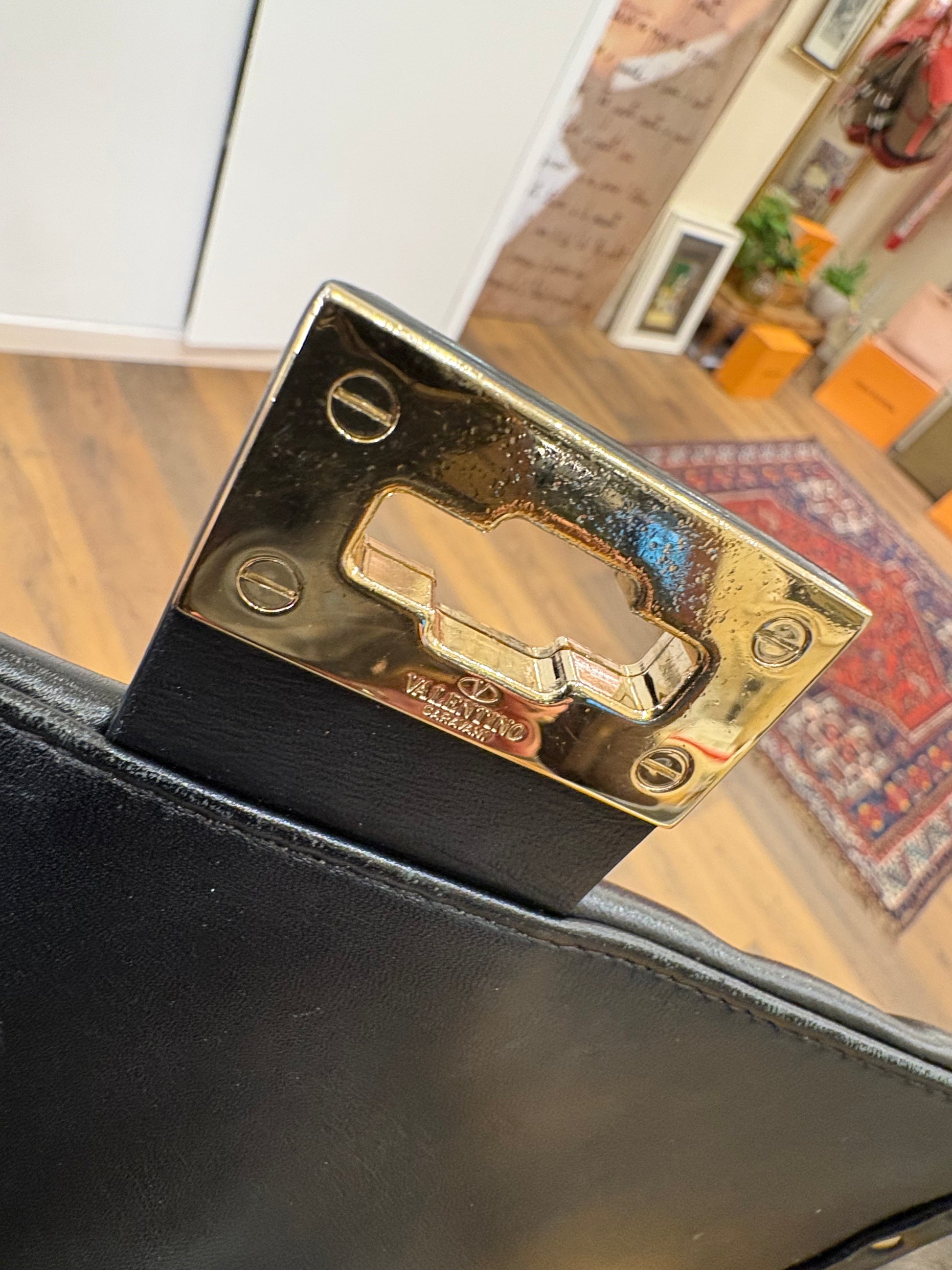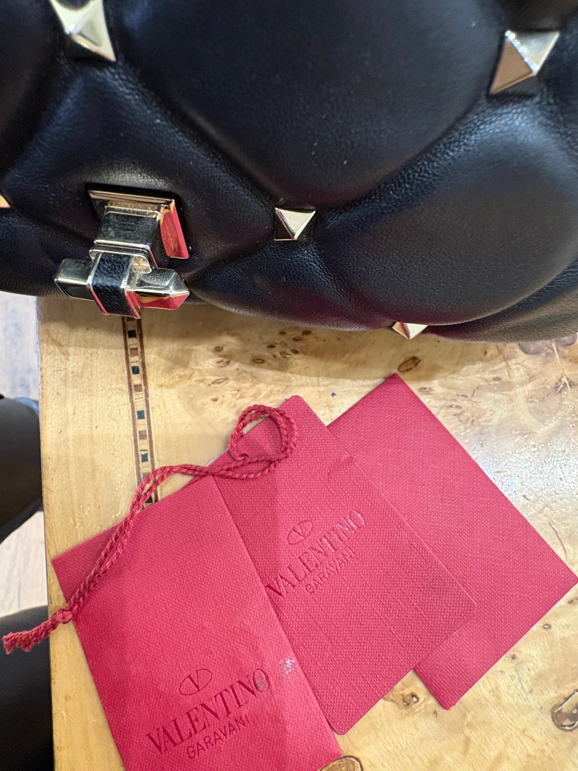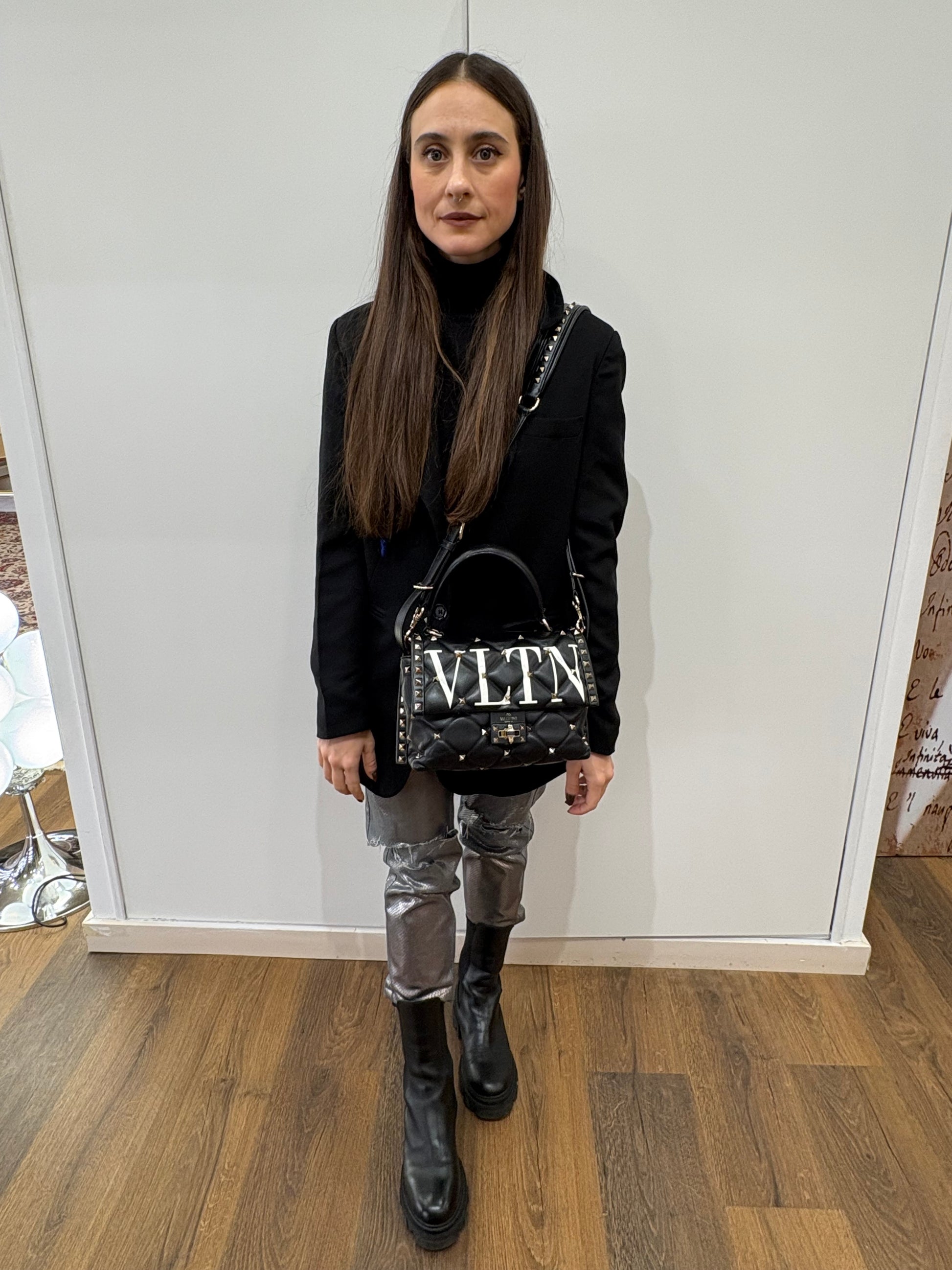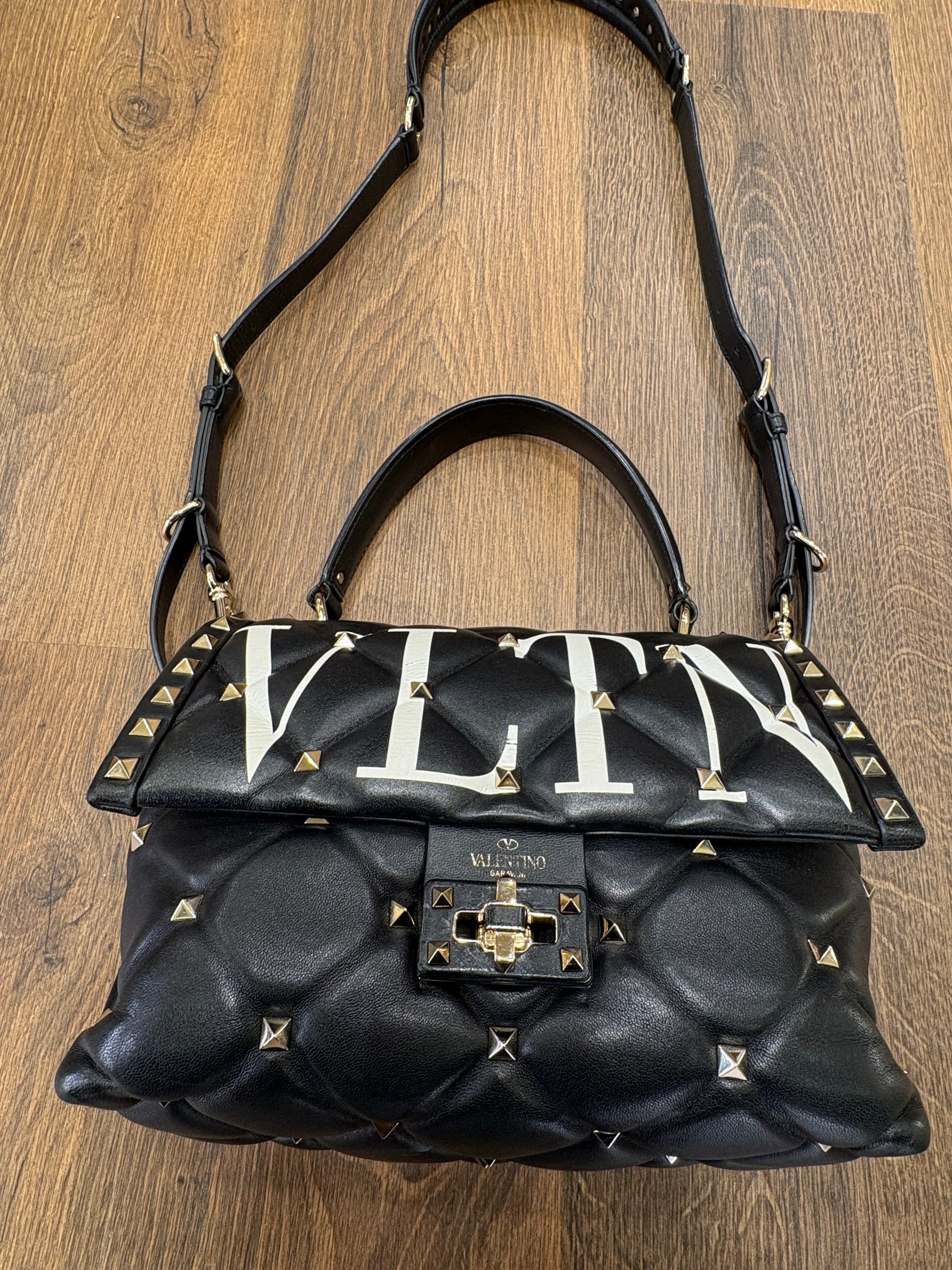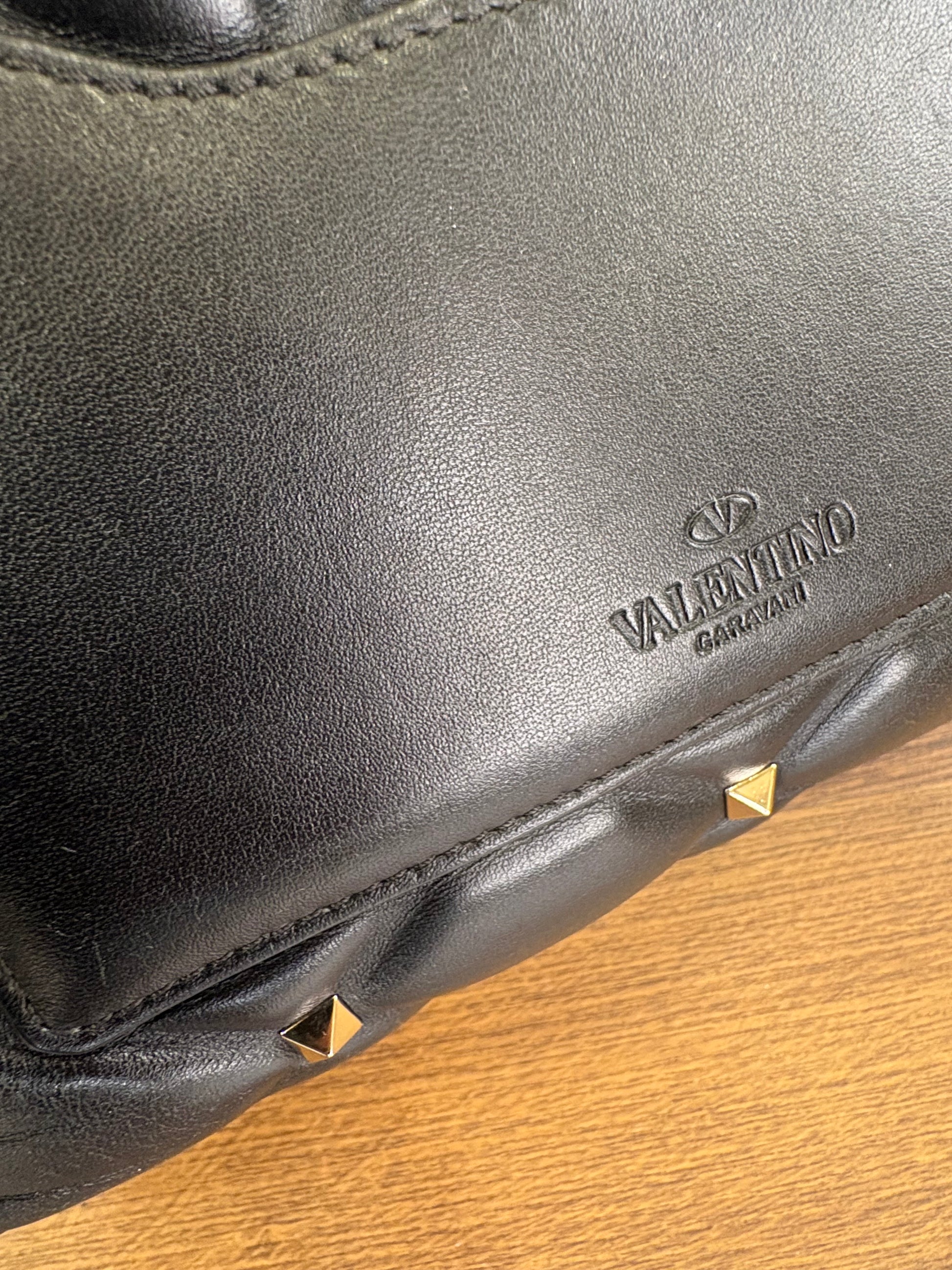 - Design: Presenta una stampa frontale "VLTN" a contrasto in bianco su una base in pelle nera trapuntata.