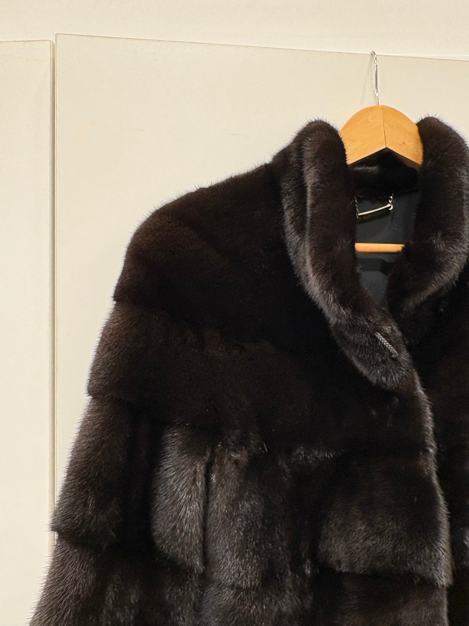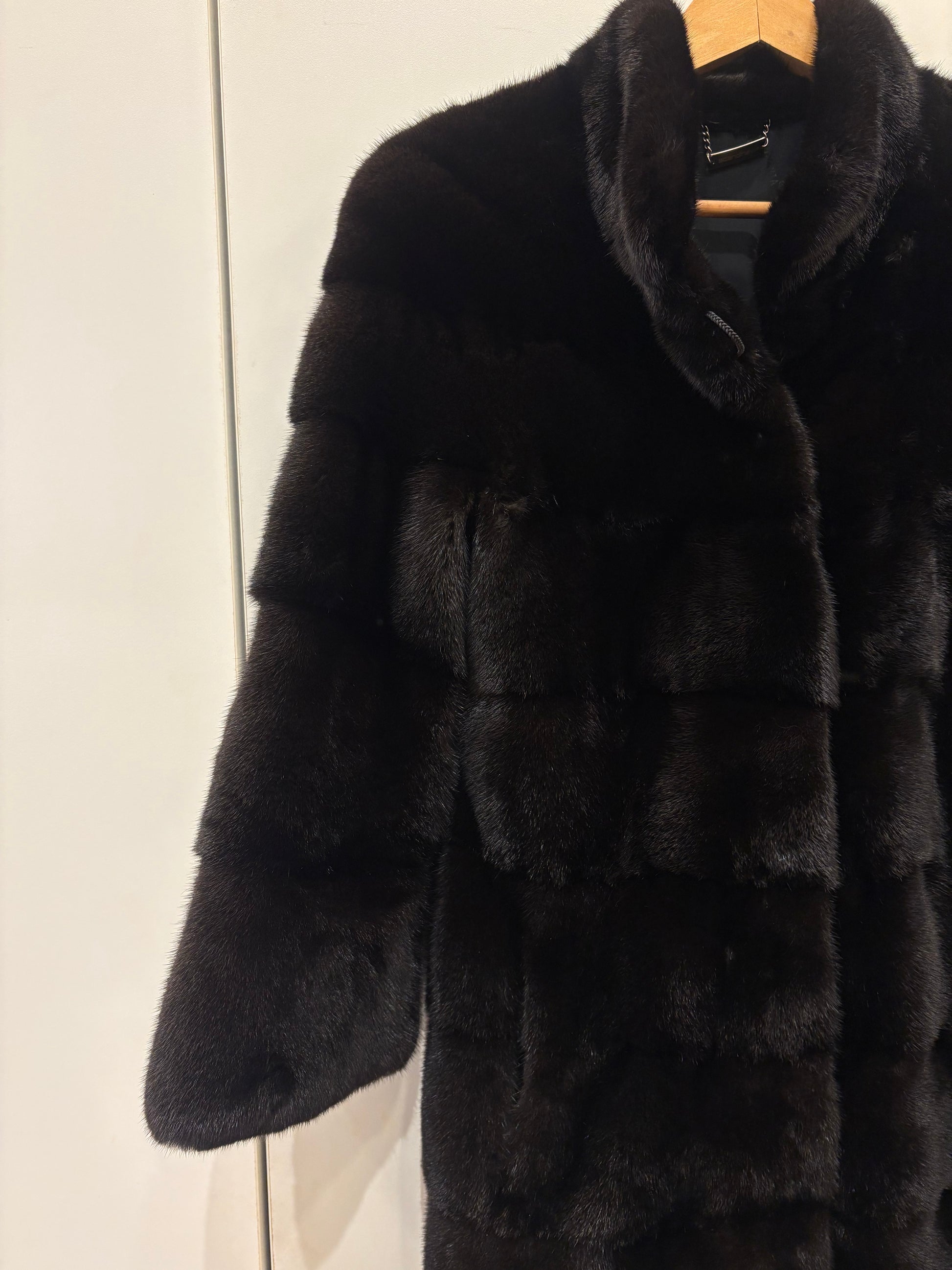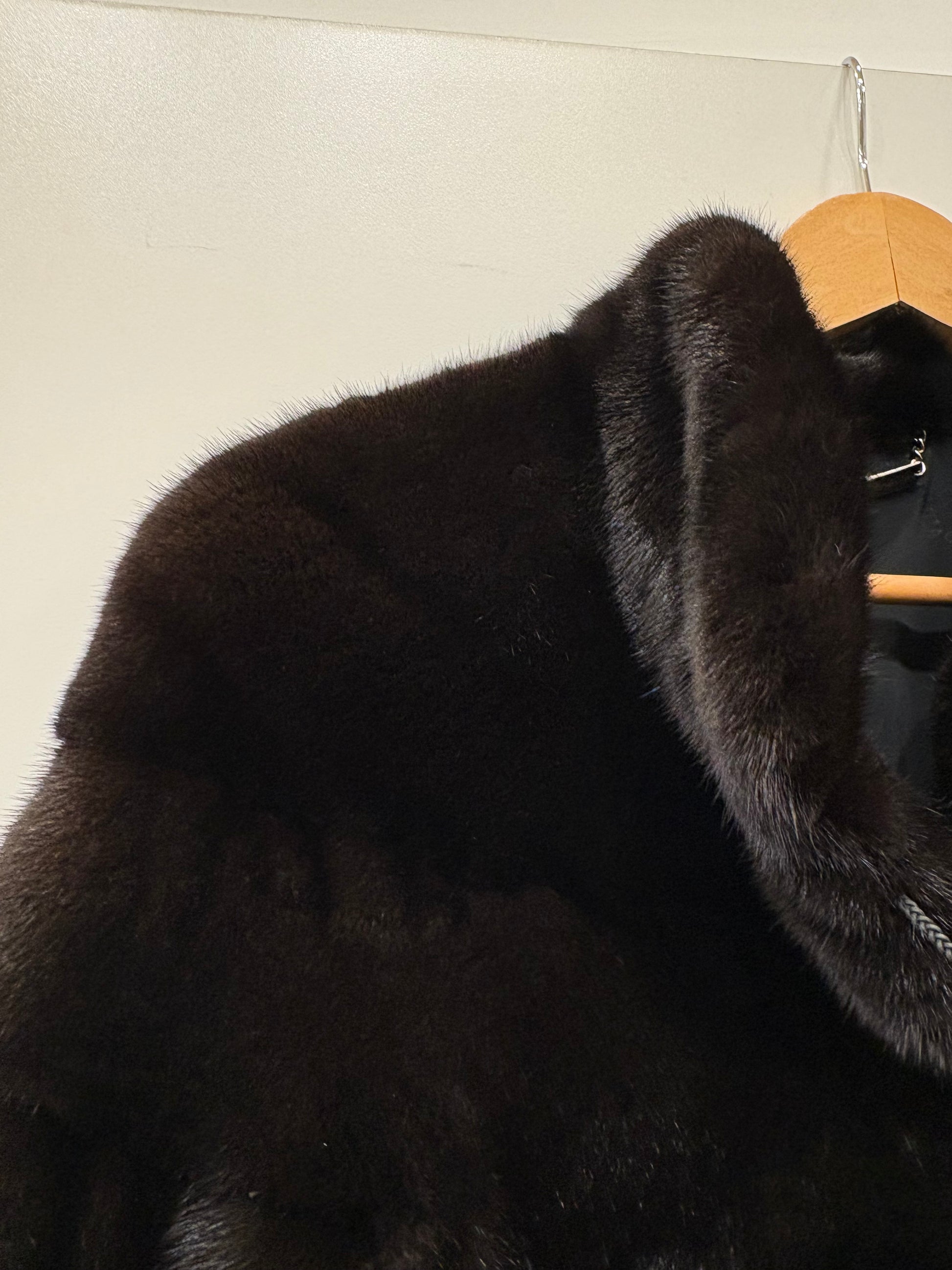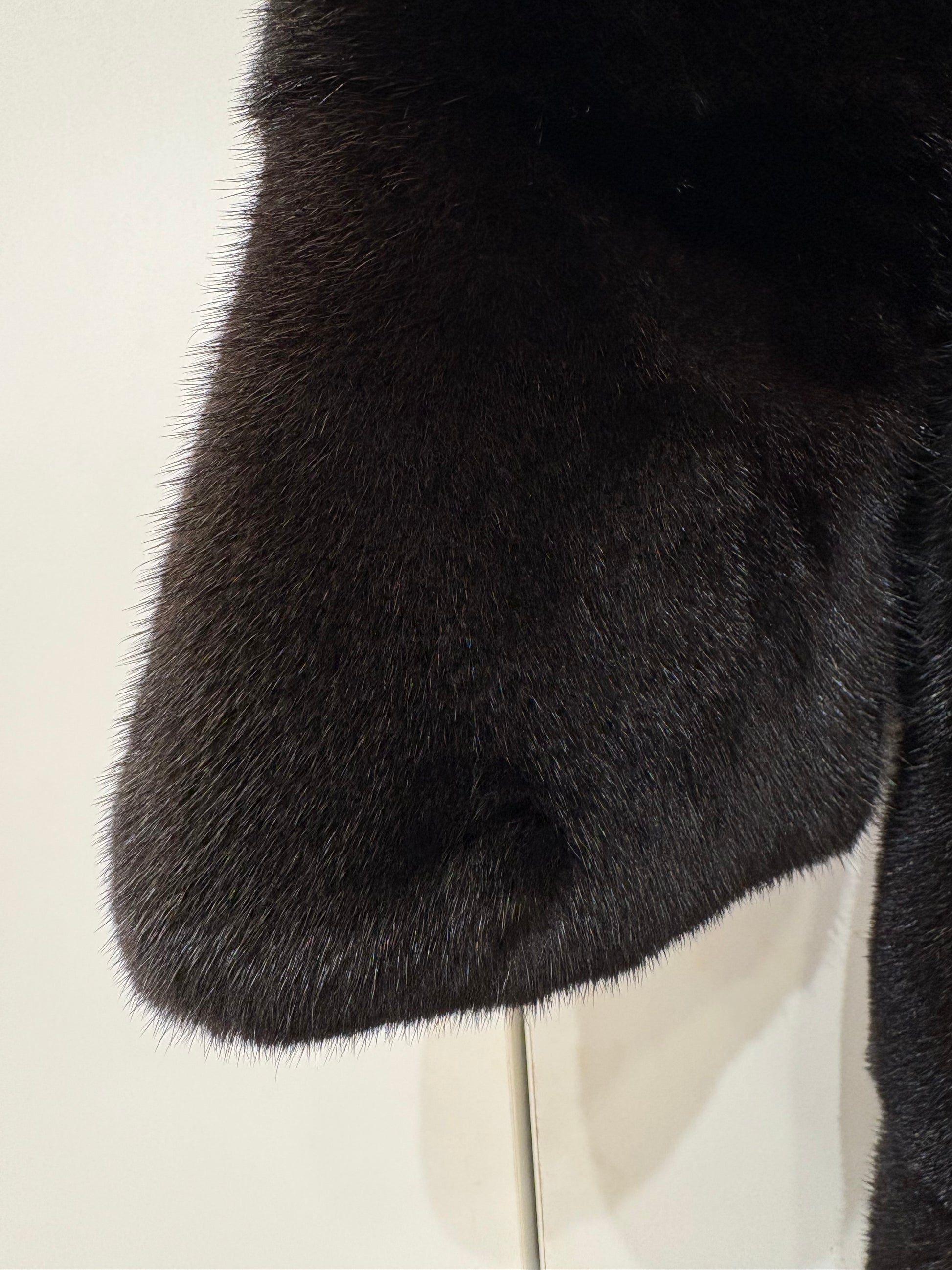 Stupendo visone nero avvitato taglio orizzontale collo rialzato e maniche 3/4 , qualità femmina , leggerissimo . Rigenerato , nuovo di pellicceria ( attuale non vintage )