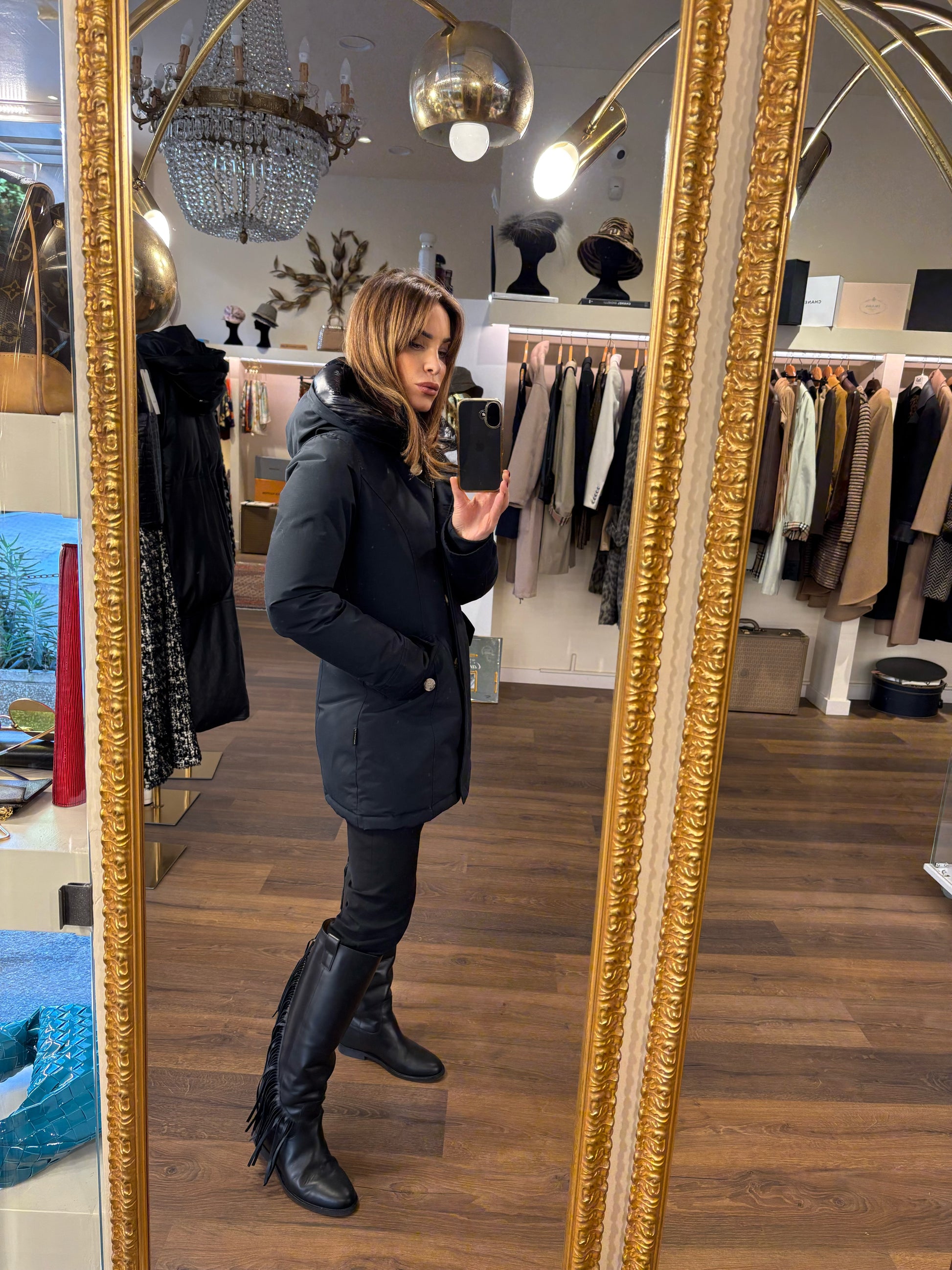 Imbottitura in piumino, cappuccio, maniche lunghe, chiusura frontale nascosta con zip, chiusura a bottoni frontale nascosta e due tasche laterali con patta.