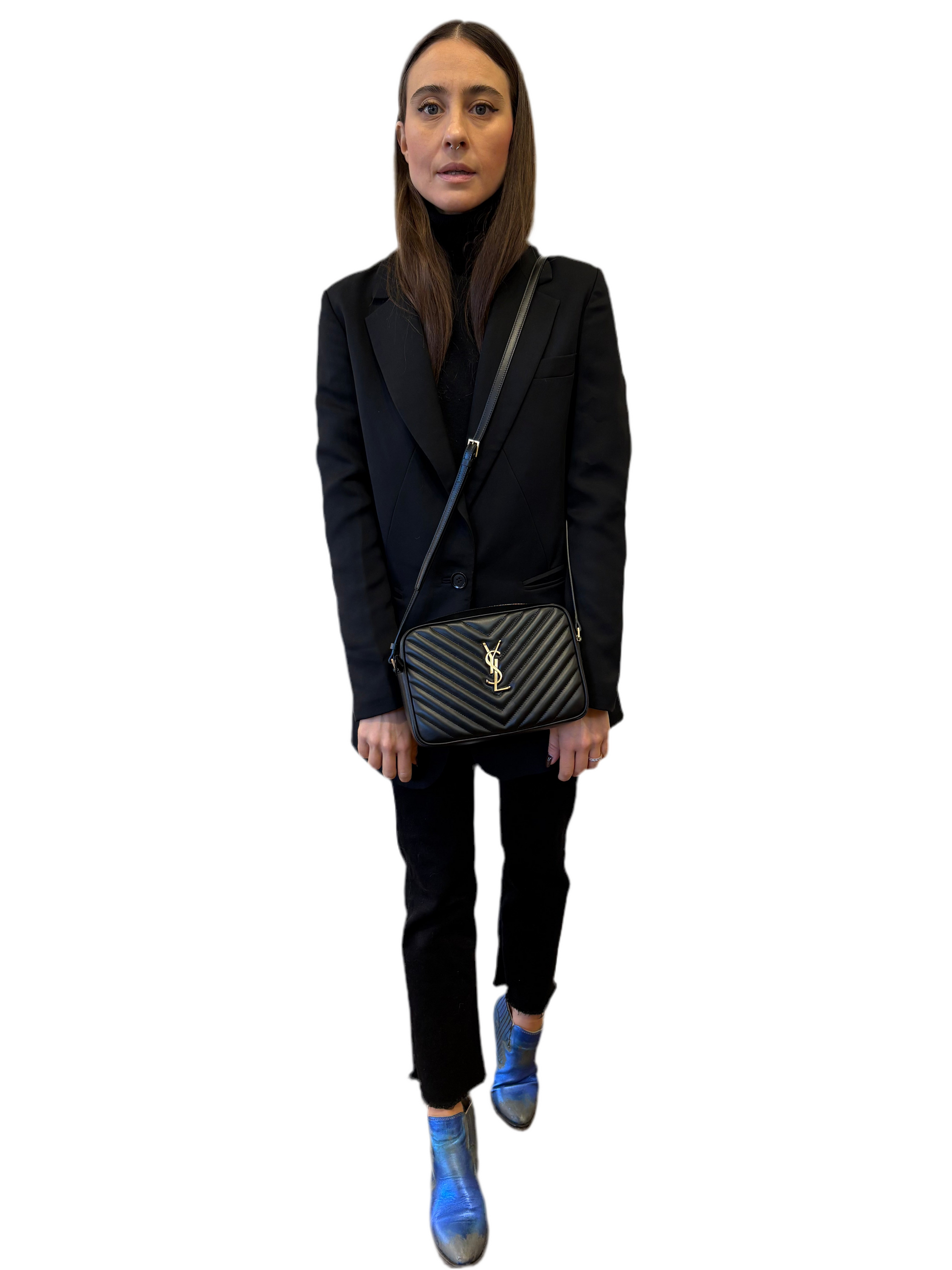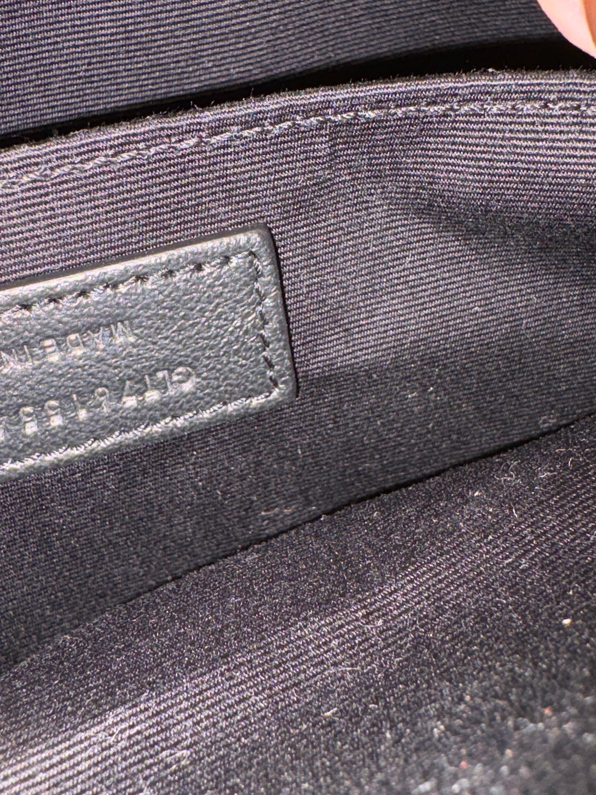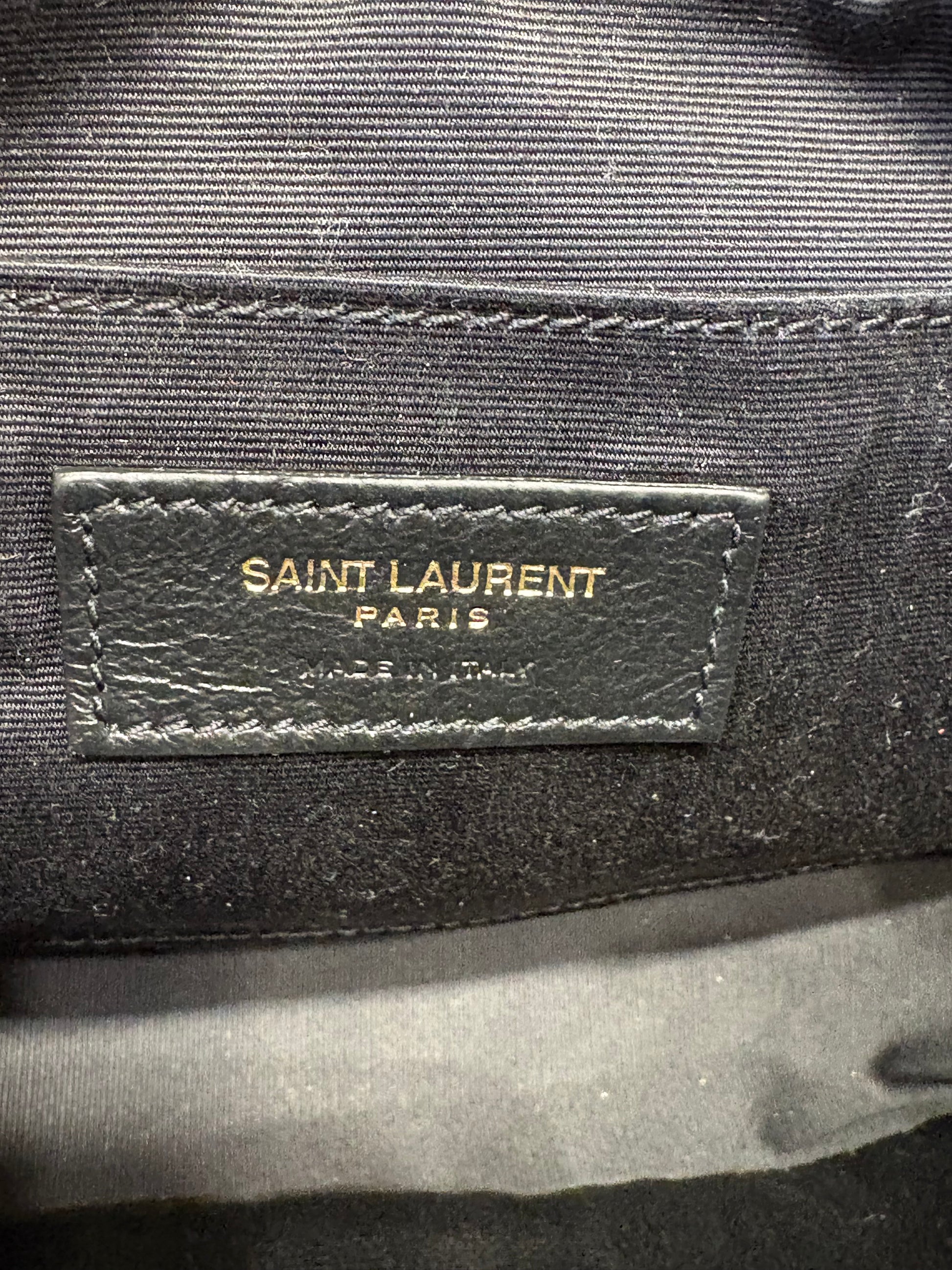 in pelle trapuntata nera, con logo YSL e hardware color bronzo.